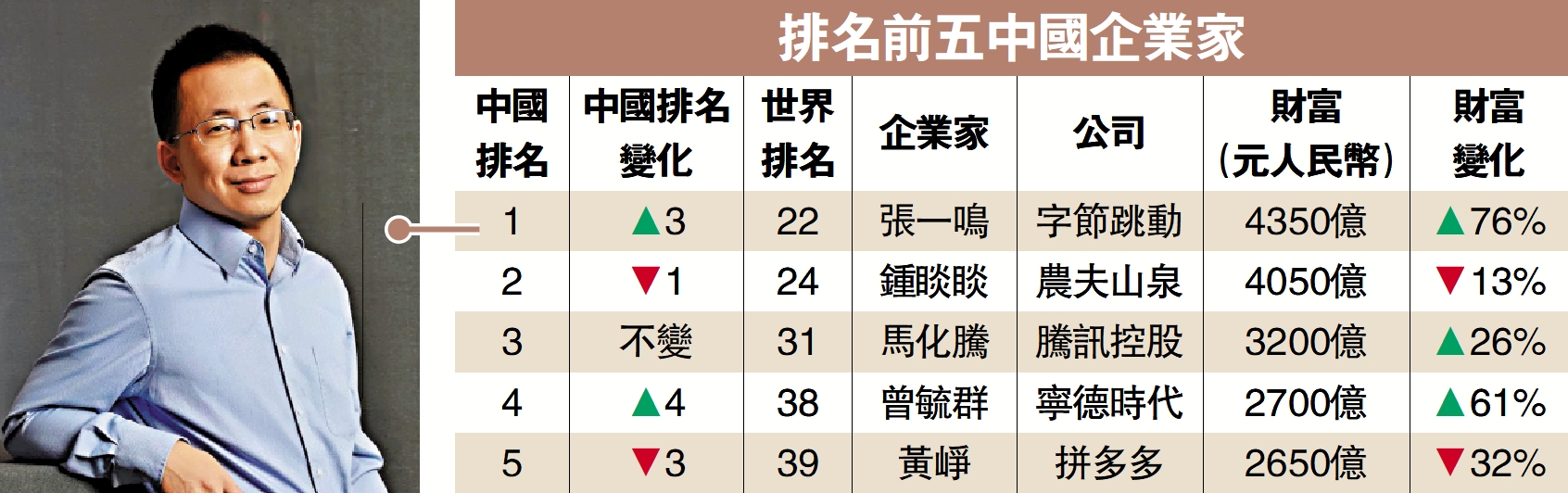 胡潤研究院昨日發布《2025胡潤全球富豪榜》,中國有823位超10億美元的企業家上榜,較去年多9位,並為全球第二多富豪上榜,僅次於美國的870位富豪。字節跳動創辦人張一鳴以4350億元(人民幣,下同)財富,取代農夫山泉(09633)董事長鍾睒睒成為中國首富;鍾睒睒以4050億元退居第二位,騰訊(00700)主席馬化騰排第三,DeepSeek創辦人梁文鋒以330億元財富首次進榜。