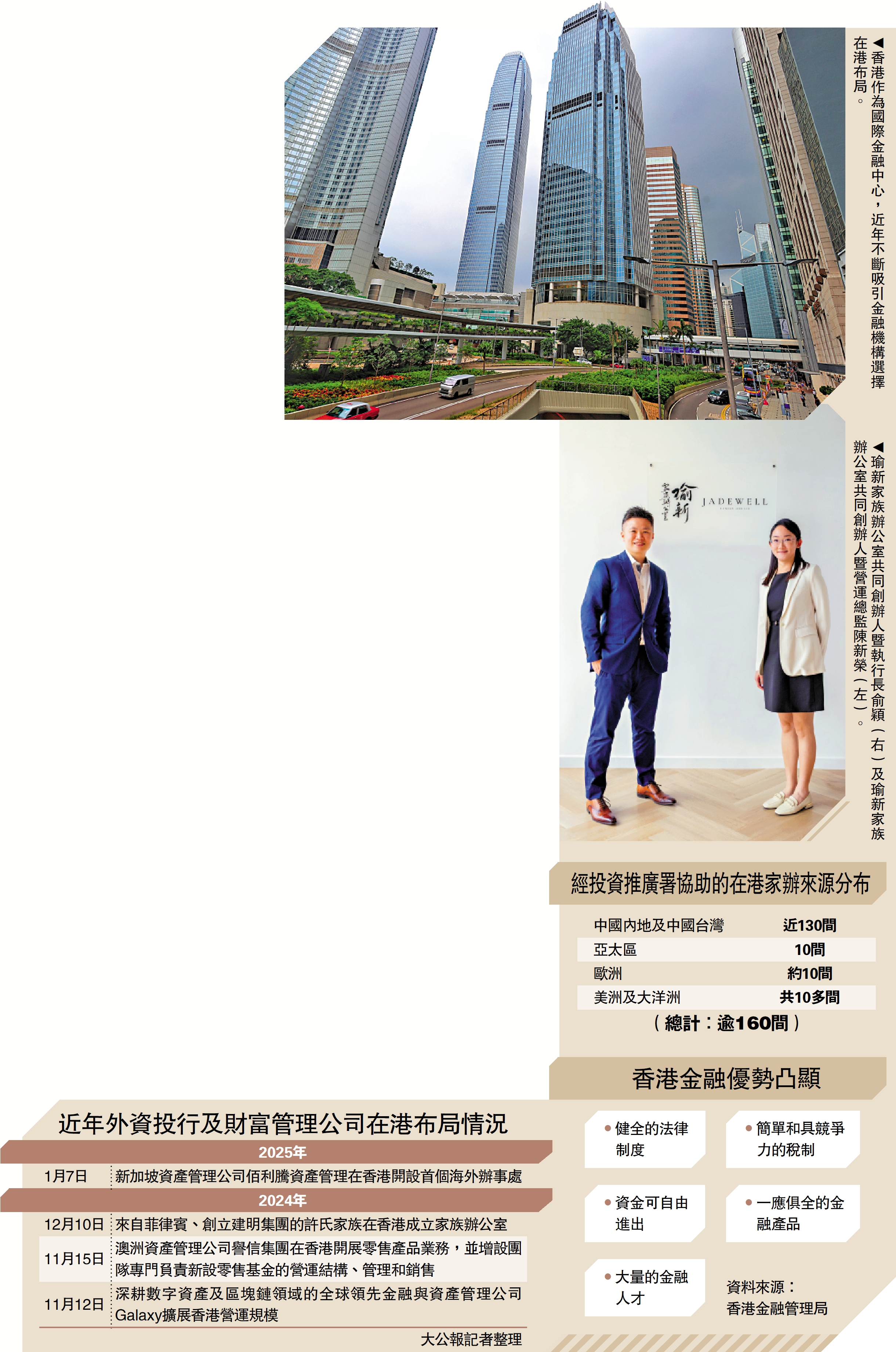 香港國際金融中心吸引力有增無減,陸續有金融機構選擇在港布局。投資推廣署宣布,去年成立的獨立財富管理顧問公司瑜新家族辦公室,正式在香港設立總部。公司共同創辦人暨執行長俞穎表示,香港有穩健的客戶基礎、成熟的金融生態系統及無限商機。另外,據外電報道指,總部位於法國和美國的兩間投資公司計劃來港設立辦事處,以把握區內市場需求。\大公報記者 蔣去悄