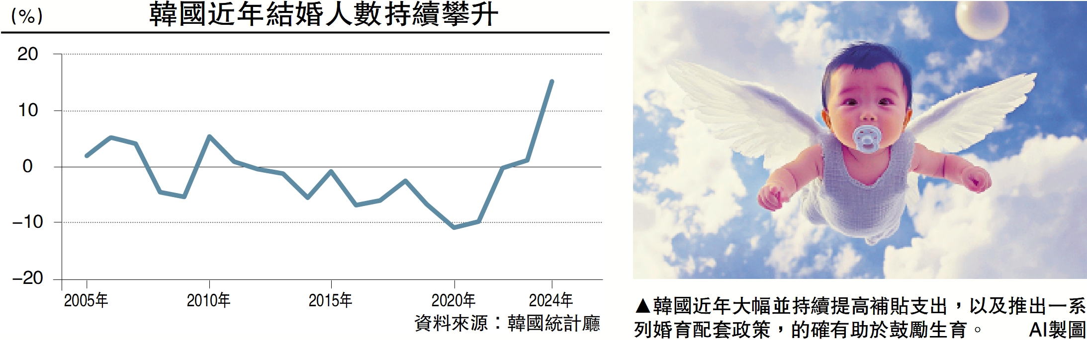得益於上述利好因素,2024年韓國結婚人數創下歷史最大升幅,合計超過22.2萬對夫婦結婚,同比增長14.8%(見配圖),遠高於前一年1%的增長率。按照OECD(經合組織)預計,韓國非婚生育子女佔比極低(2.5%左右),結婚人數上升意味着2025年出生人口還會出現大幅增長。