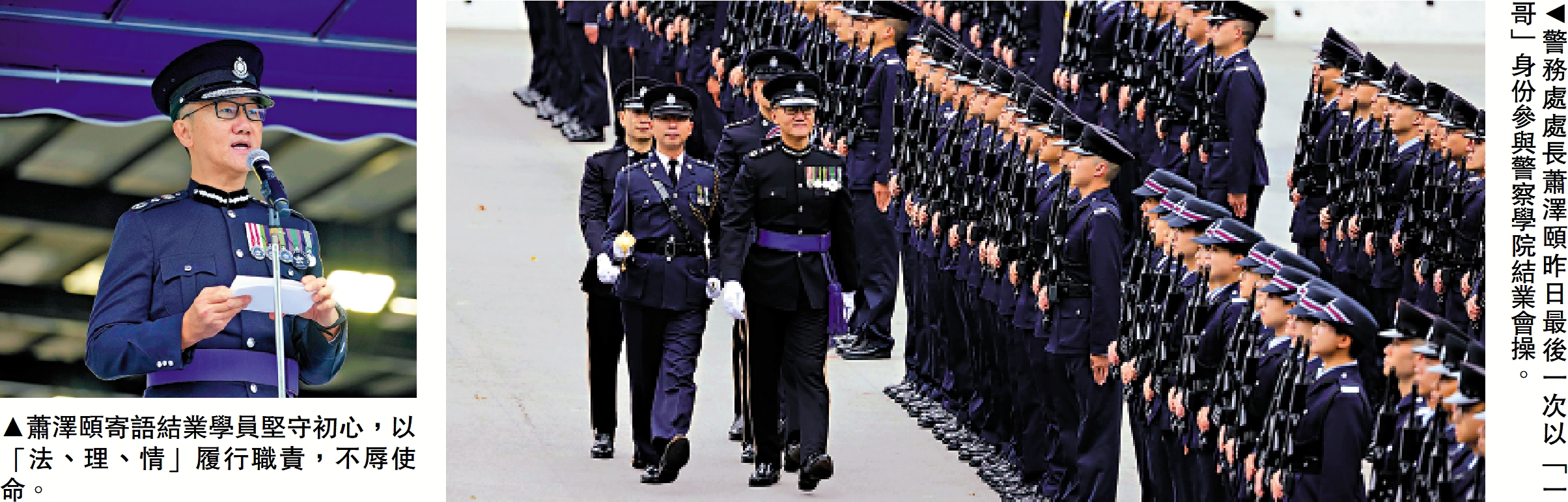 【大公報訊】大公文匯全媒體記者王俊傑、鄭洢林、秦英偉報道:香港警察學院昨日(29日)舉行結業會操,共187人接受檢閱。將於今年4月1日任期屆滿的警務處處長蕭澤頤擔任檢閱官,向八名學員頒發最優秀學員獎。
