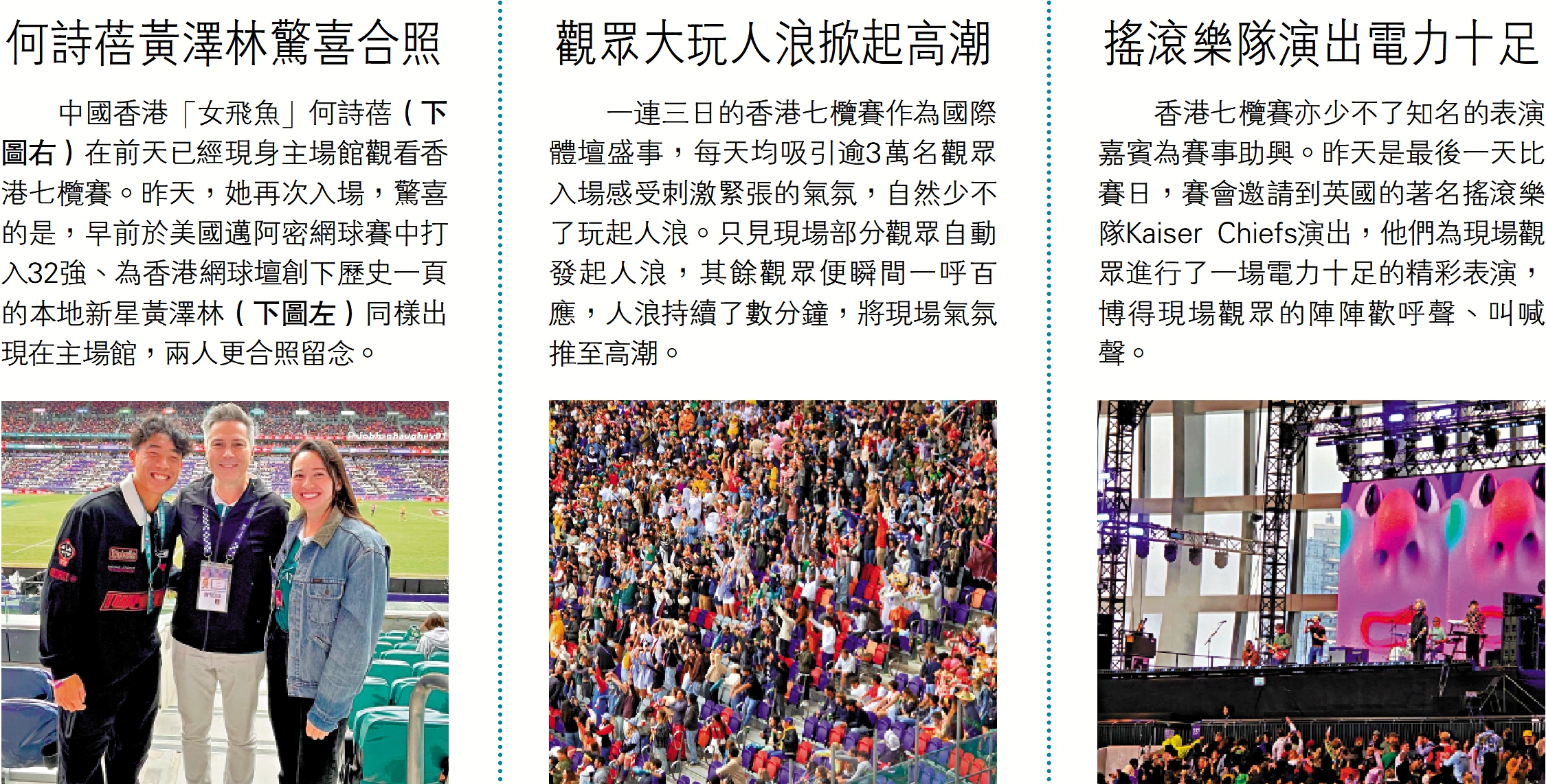 香港七欖賽亦少不了知名的表演嘉賓為賽事助興。昨天是最後一天比賽日,賽會邀請到英國的著名搖滾樂隊Kaiser Chiefs演出,他們為現場觀眾進行了一場電力十足的精彩表演,博得現場觀眾的陣陣歡呼聲、叫喊聲。