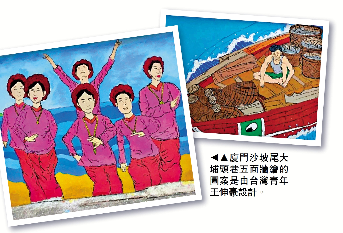 據王伸豪介紹,總長約15米、高約3米的五面牆以藍色大海為背景,分別繪製不同主題圖案──廈港釣艚船、非遺延繩釣、討海人收漁獲、討海人捕魚、蜑民舞蹈,生動呈現了廈門漁港文化,喚醒了市民關於廈門港的記憶,也讓遊客感受到獨特的漁港文化韻味。