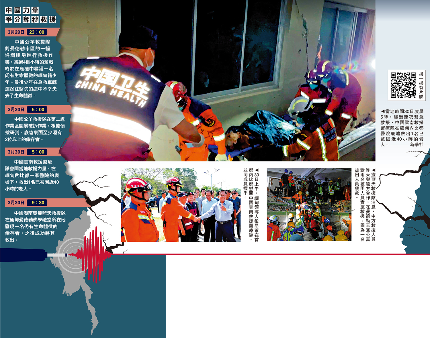中國多支救援隊正在緬甸地震災區全力開展搜救,截至當地時間31日零時40分,已在當地救援力量配合下成功救出三名倖存者。