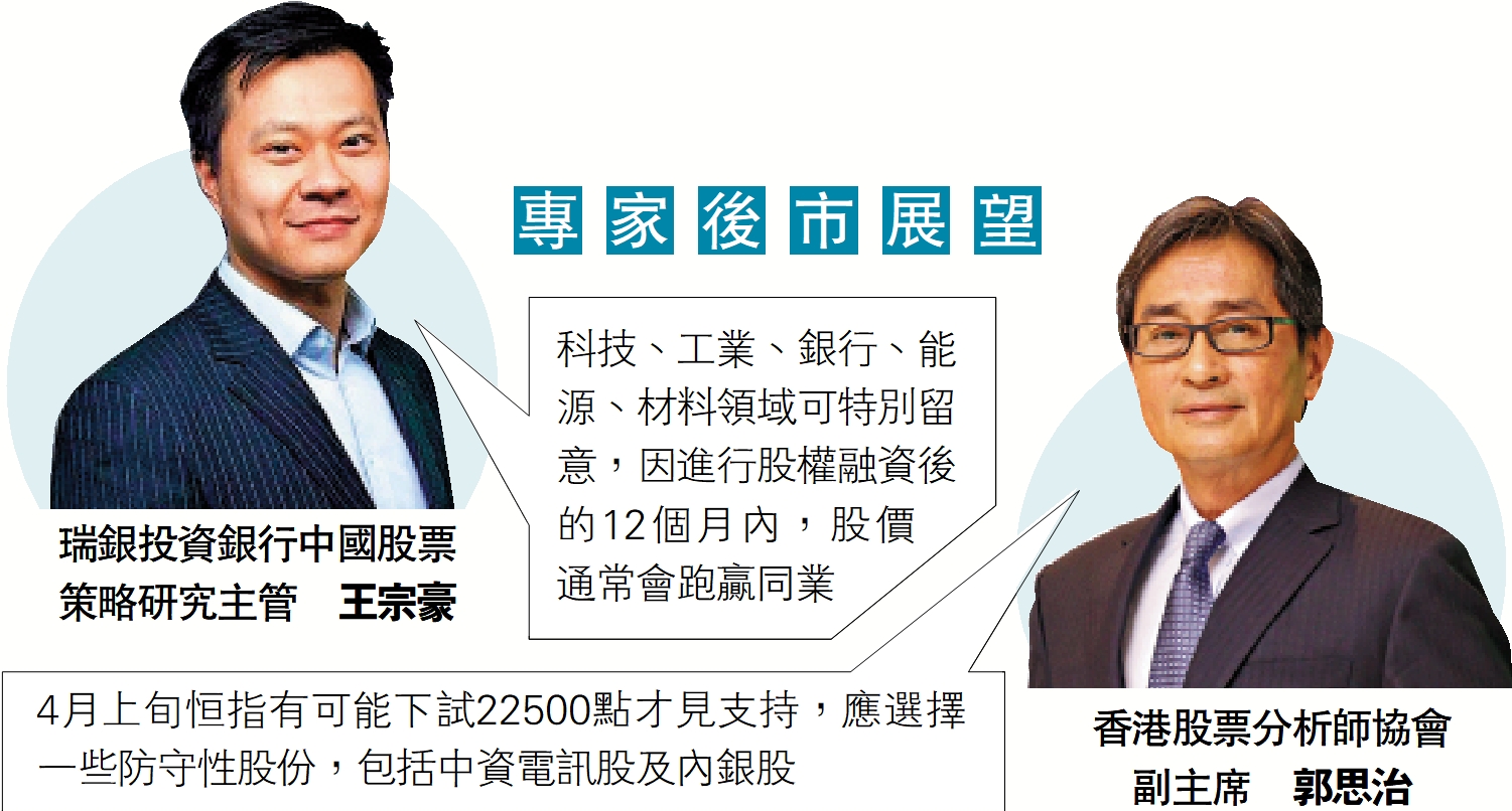 4月上旬恒指有可能下試22500點才見支持,應選擇一些防守性股份,包括中資電訊股及內銀股