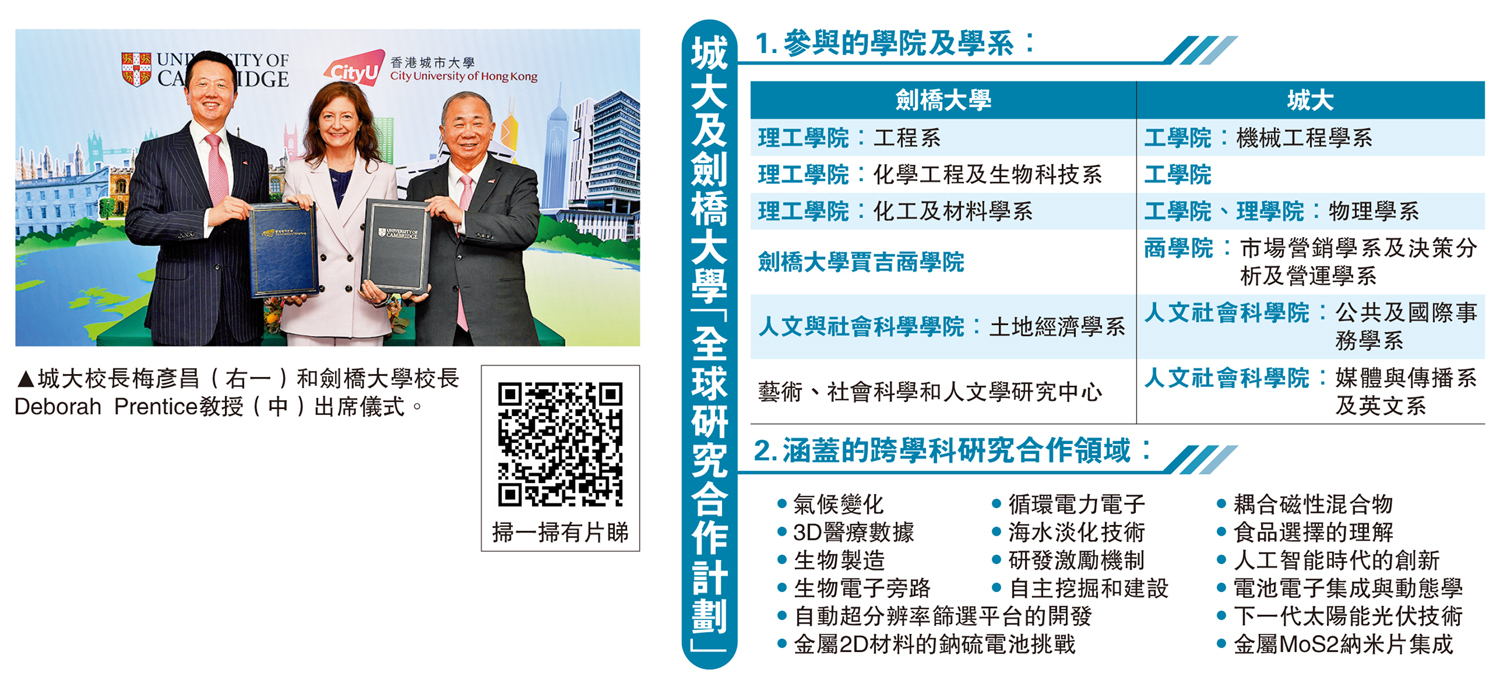 城大梅彥昌校長表示:「我們期望能攜手創造具全球影響力的創新研究。是次與劍橋大學的合作計劃更充分體現兩校透過持續推動創新,以應對全球緊迫挑戰的共同願景。」