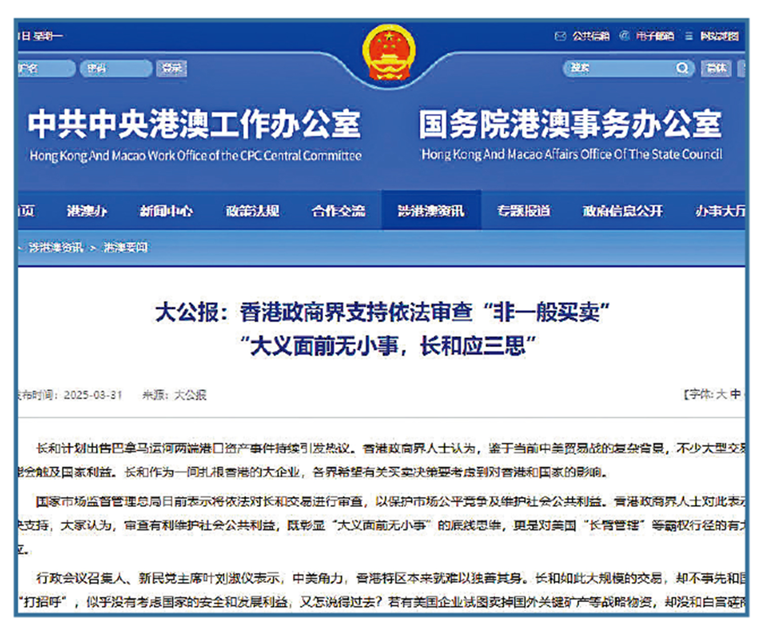 【大公報訊】港澳辦網站昨日再次轉載《大公報》文章,題為《依法審查長和「非一般買賣」 香港政商界堅決支持 「有國家作靠山,企業才能後顧無憂」》。文中引述多名立法會議員指出,國家市場監督管理總局對長和出售巴拿馬運河港口等資產的審查,是維護市場公平的必要舉措,又指香港政商界希望長和配合好今次反壟斷審查,重塑良好企業的形象,贏得公眾信任。