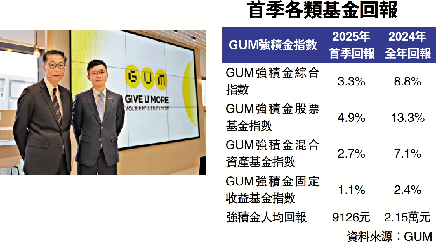 【大公報訊】在內地及香港股市急升帶動下,GUM公布2025年首季強積金(MPF)錄3.3%回報,打工仔人均賺9126元,接近2024年人均回報的一半。GUM常務董事陳銳隆表示,關稅政策對港股表現影響有限,兩會提振經濟政策陸續落實,消費明顯有所好轉,加上內地科技產業突破,預期恒指第二季尾有機會見24000點,強積金今年上半年可望錄得5%回報。