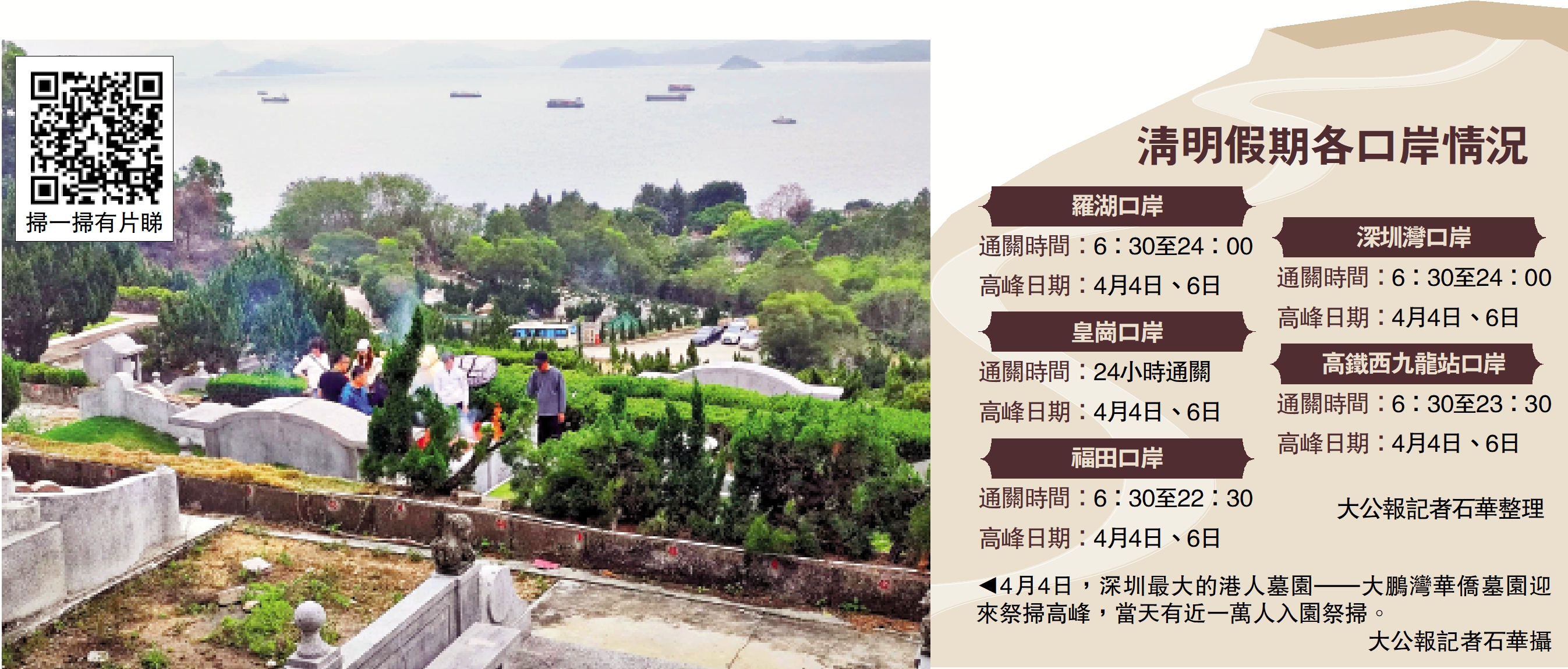據介紹,每年約有3萬名港人到華僑墓園祭掃,祭掃活動從3月初將持續至四月底。記者從該墓園管理處獲悉,為方便港人祭拜先人,管理處首次提供了免費巴士服務。港人只需乘坐地鐵至小梅沙站,從C出口出站後,乘坐巴士僅需十分鐘即可抵達墓園。\大公報記者 石華深圳報道