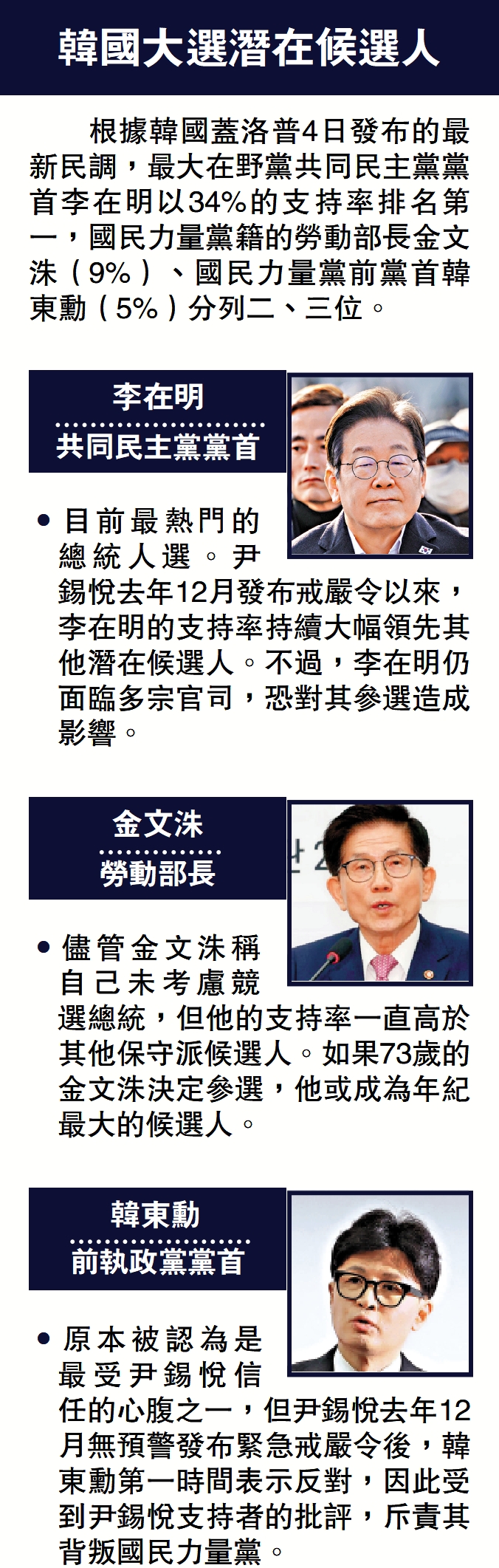根據韓國蓋洛普4日發布的最新民調,最大在野黨共同民主黨黨首李在明以34%的支持率排名第一,國民力量黨籍的勞動部長金文洙(9%)、國民力量黨前黨首韓東勳(5%)分列二、三位。