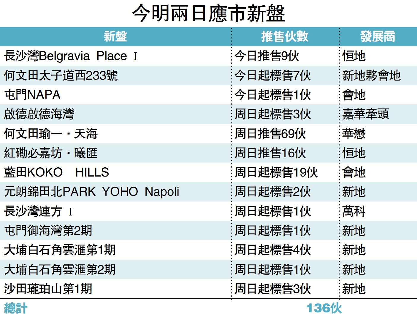 【大公報訊】缺乏全新盤登場下,清明節一連三天假期只靠貨尾盤撐場。據一手住宅物業銷售網資料,今起一連兩日有13個項目共涉136伙以價單及招標形式應市,其中華懋的何文田站瑜一·天海,安排明天(周日)出售69伙,屬最大規模的推售活動。