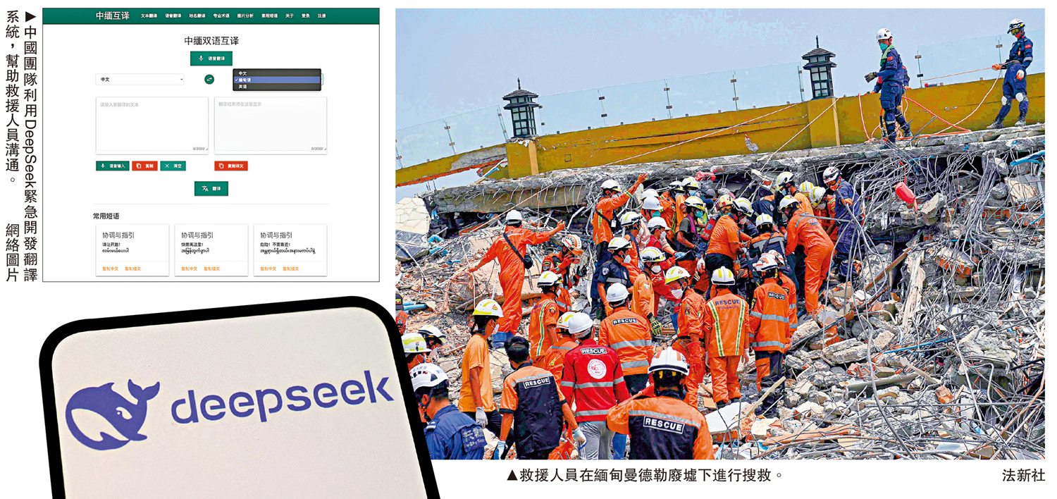【大公報訊】在本次緬甸強震中,中國人工智能模型深度求索(DeepSeek)發揮開源優勢,幫救援人員打破語言藩籬,是中國開源AI模型首次用於地震國際救援。中國駐緬甸使館透露,中國救援隊前方在使用基於DeepSeek緊急開發的中緬英互譯系統。