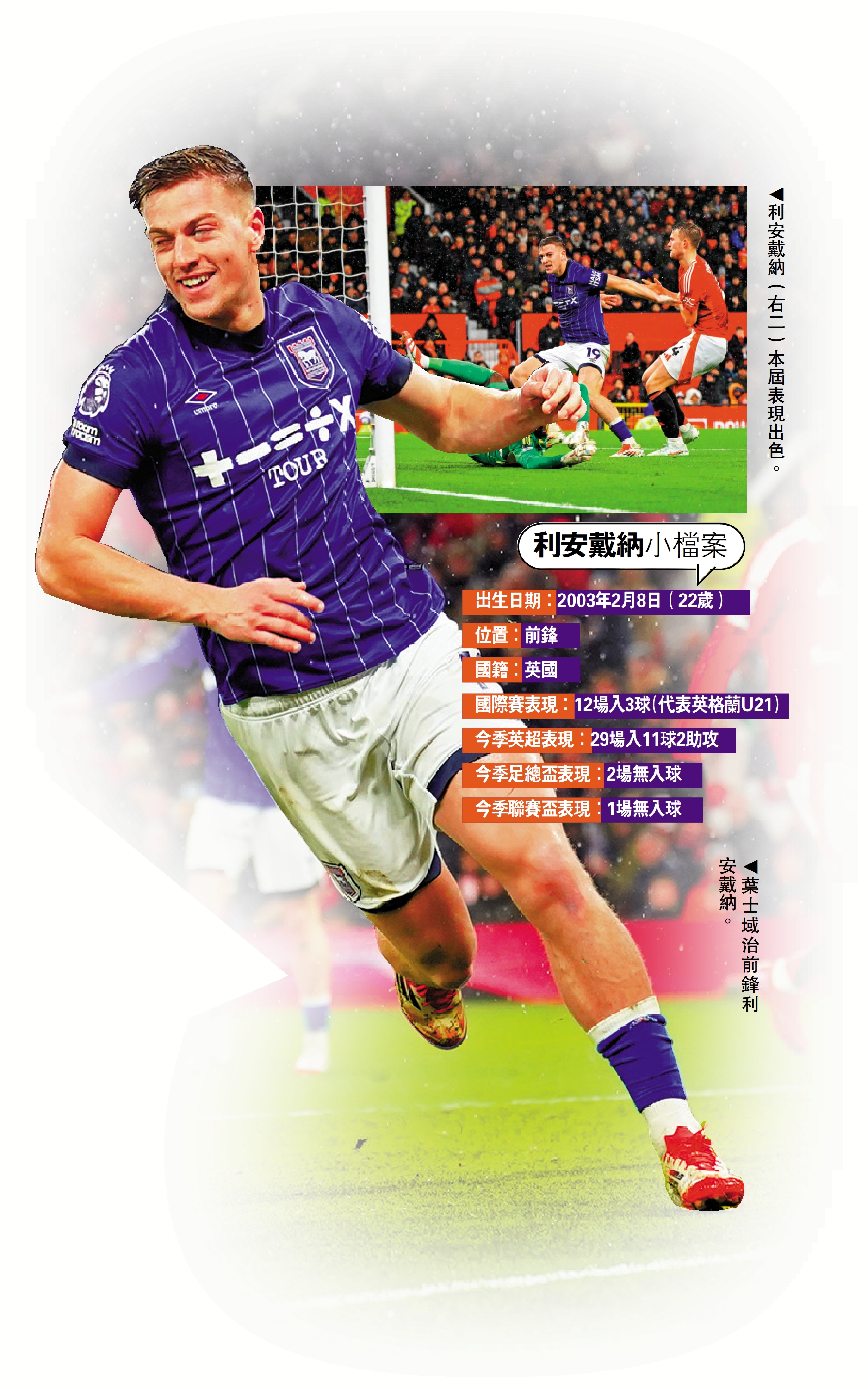 利安戴納原本是打吡郡青訓球員,他於2019年轉為曼城青訓球員後,僅為一隊上陣兩場賽事,由於競爭激烈,未升上一隊前,他已在上季以1500萬英鎊轉投葉士域治。葉士域治今季以「升班馬」身份挑戰英超,整體成績只能說是慘不忍睹,30輪後以4勝8和18負積20分的成績排名第18位,在餘下8輪賽事下,落後在護級區域第17位狼隊達9分。不過葉士域治陣中仍有一名出色球員,他正是新加盟的利安戴納,這位昔日史篤城「手榴彈之王」戴納之子,經過曼城6年青訓後已成獨當一面的射手,葉士域治今季在英超射入30球,戴納個人便獨佔逾3分1,一個人便比曼聯前線海倫(3球)、約書亞舒克斯(3球)及阿歷真度加拿祖(4球)加起來還要多,難怪有傳曼聯正打算收購這名射手去改善前線入球力欠佳的問題。
