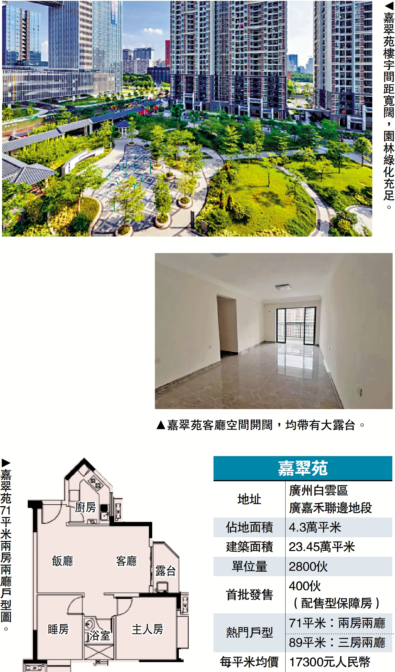 位於廣州白雲新城核心區域的嘉翠苑,是另一個配售型保障房項目,共提供2800個單位,包含公租房和配售型保障性住房,其中配售型保障房共400伙,是次全數推出,包括面積71、72平米的兩房兩廳,以及89平米的三房兩廳,每平米銷售基準價17300元(人民幣,下同)(約18500港元)。