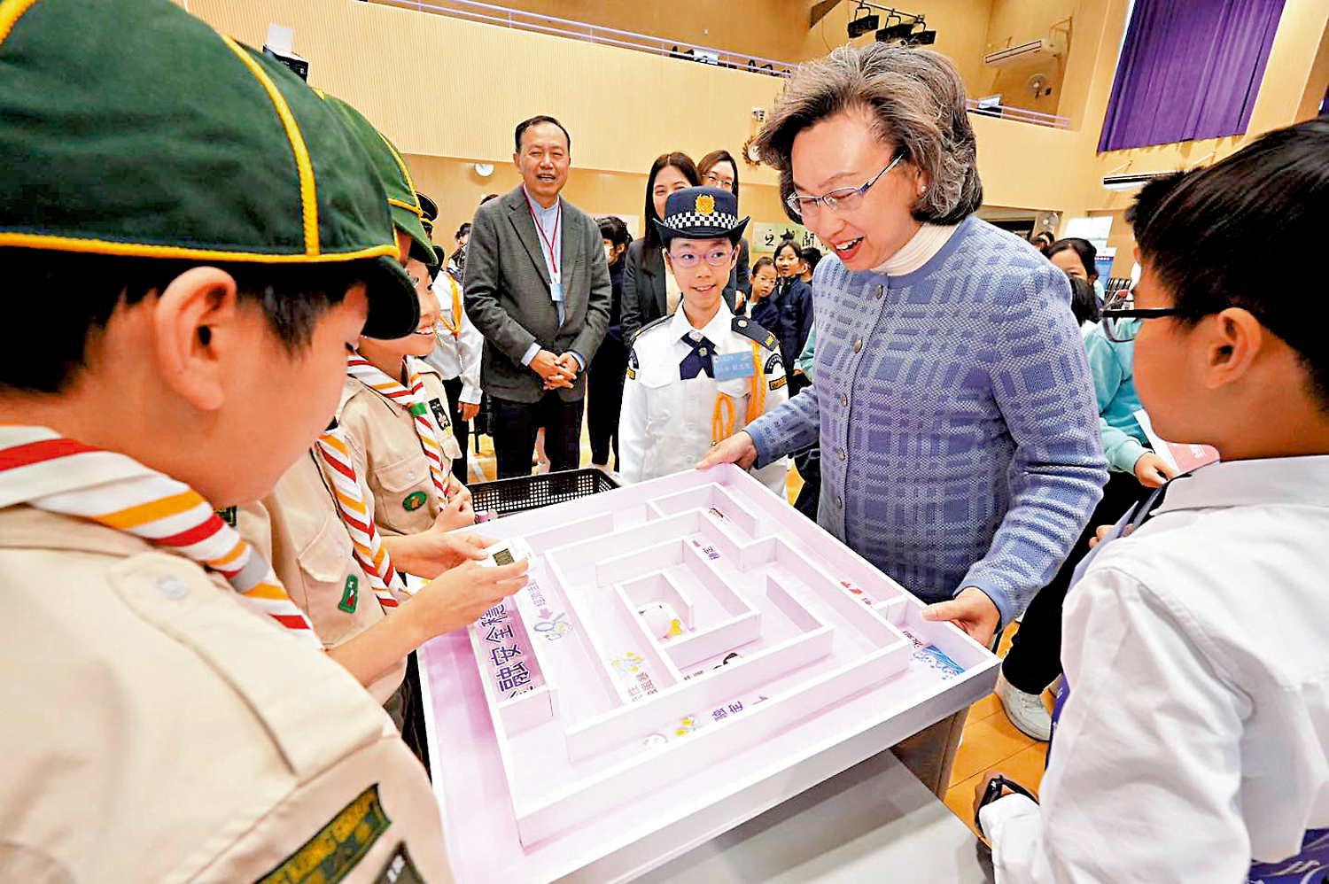 楊何蓓茵在培僑小學校監周世耀和校長吳佳筠陪同下,首先聽取了學生代表分享參與學校各類與國安教育相關活動的體驗和感受,並進行互動交流。升旗隊成員、五年級的劉同學表示,升旗隊定期熟習升旗儀式的每一個環節,這令各成員全面認識國家象徵的國旗、國徽和國歌,也透過用心掌握中式步操,訓練各成員的團隊合作精神。六年級的謝同學指出,學校舉辦多元化的學習活動,包括參與升國旗儀式、觀看愛國電影等,將國家安全意識、愛國情懷融入同學的生活當中。本身是憲法和基本法大使的謝同學表示,會繼續做好傳播者的角色,推廣憲法和基本法。
