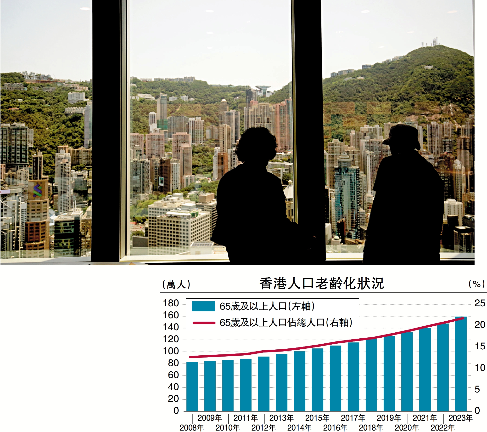 其一,香港面臨嚴峻的人口老齡化問題。2023年65歲及以上的人口達158萬人,佔總人口21.65%,預期2046年這一比例將升至36%。香港的養老機構及安老床位供應不足,根據仲量聯行數據,2020至2032年間,65歲或以上人口數量預期增幅為46.3%,而安老院床位預期增幅僅0.24%,2032年前將出現超過6萬個長者房屋的空缺。除了居住問題,香港安老服務面臨的另一個難題是生活成本偏高,長者貧困人口佔總貧困人口超過40%。特區政府對長者投入大量援助,比如「長者生活津貼」,同時結構性長者貧困及老無所養等議題需要配套政策提供持續支持,比如鼓勵居家養老、加強長者早期照顧及醫護,減輕公立醫院服務壓力。