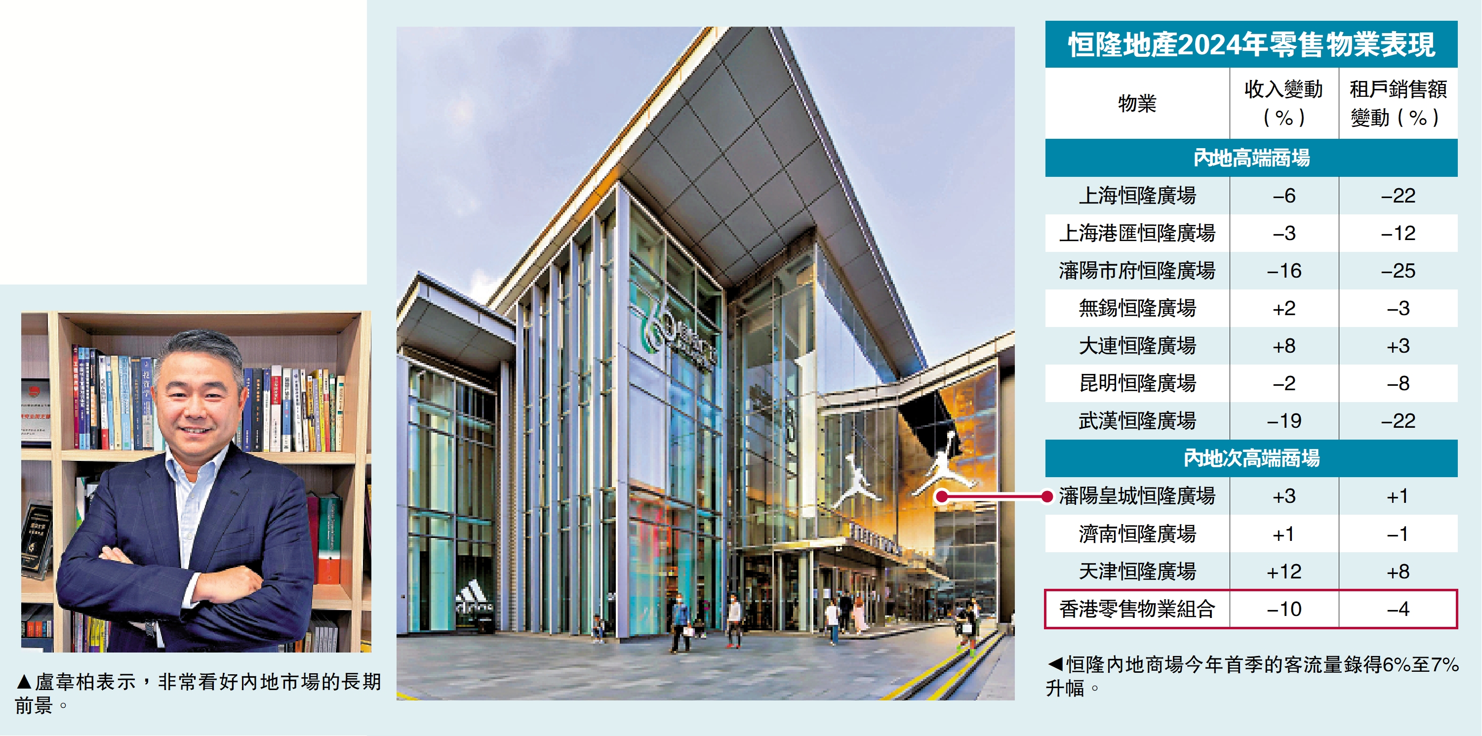 盧韋柏稱,今年內地零售租金收入視乎銷售走勢,希望能取得增長,至於辦公樓物業因市場供過於求影響招租率,或導致收入下跌,整體表現可能較差。