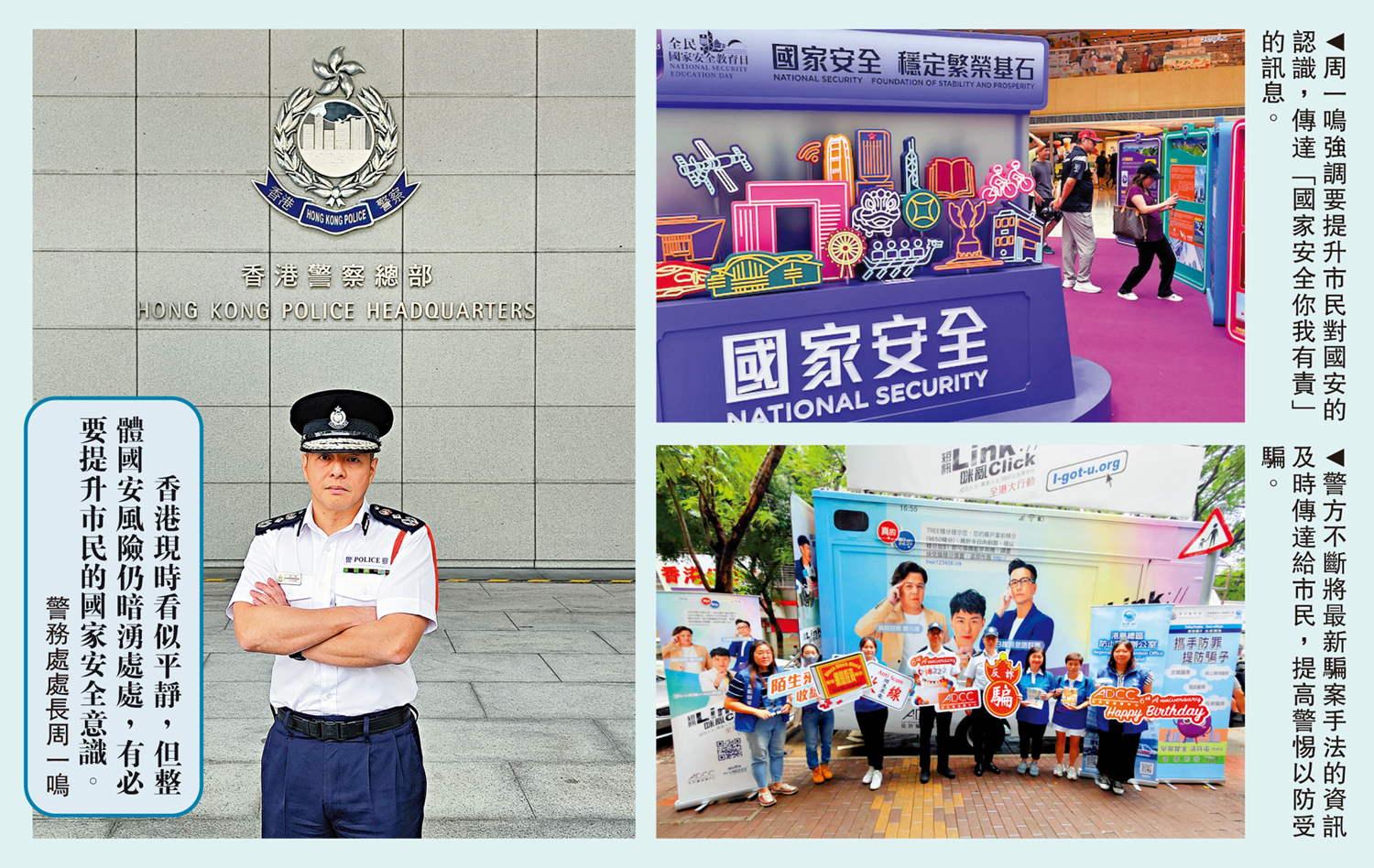警務處處長周一鳴表示,上任後有三個工作方向,分別是維護國家安全、推動智慧警政,以及鞏固團隊文化,帶領警隊提升自身能力,令香港繼續安全、穩定。在維護國安方面,他指出,雖然香港現時看似平靜,但仍暗湧處處,並非完全無國安風險,因為仍有一些人蠢蠢欲動藉不同機會搞事,嘗試誣衊《維護國家安全條例》,有些國家不想看到香港有國安法或《維護國家安全條例》,是希望繼續危害香港安全,因此,有必要提升市民的國家安全意識。周一鳴表示,現時不少學校正在推行國家安全的教育,警方亦會在本月13日舉辦「全民國家安全教育日暨警隊博物館開放日」,以提升市民對國安的認識,以及傳達「國家安全你我有責」的訊息。