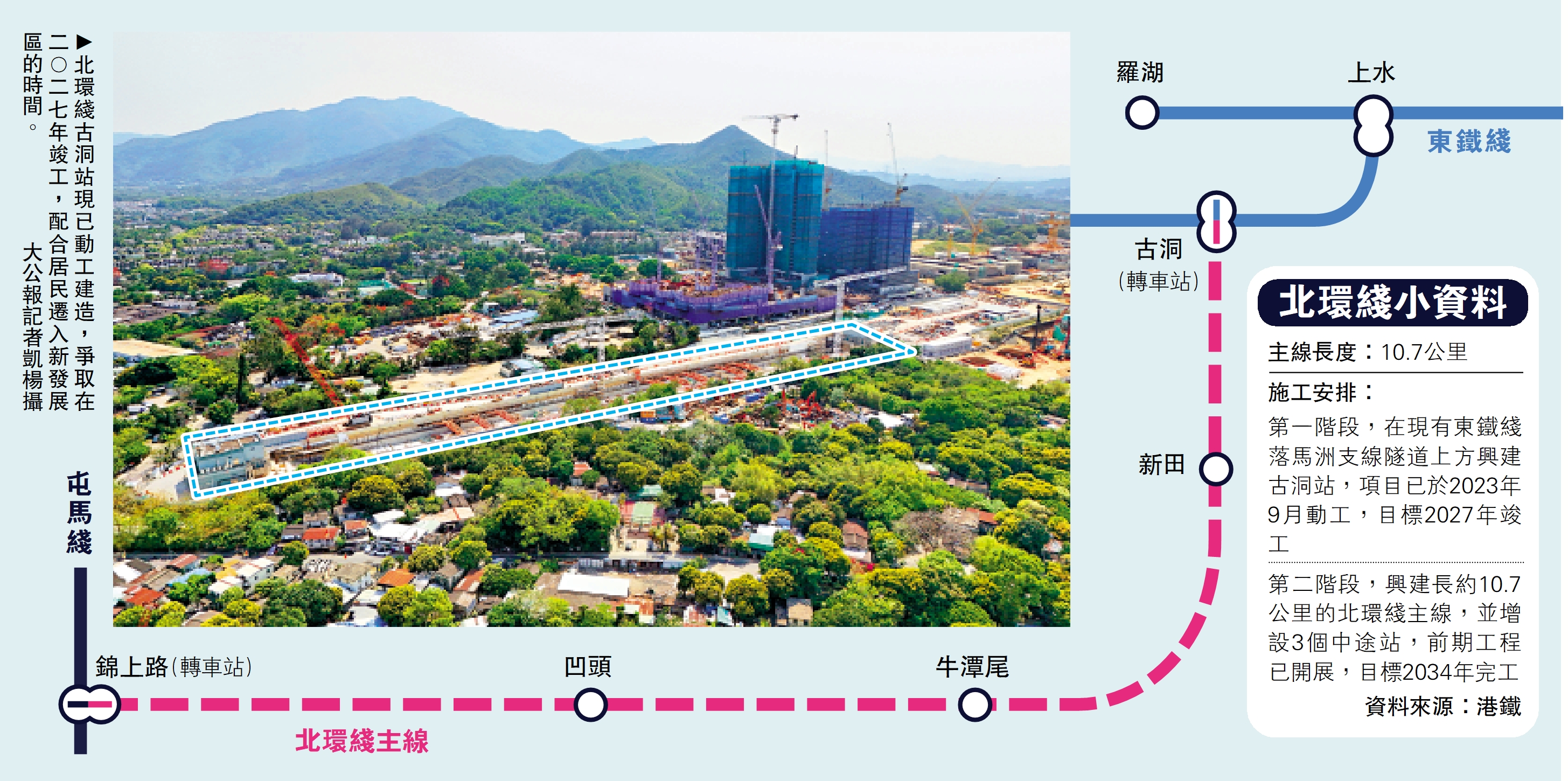 北環綫項目共分兩個階段推展,首階段先在現有東鐵綫落馬洲支線隧道上方興建古洞站,已於2023年9月動工,目標在2027年竣工,以配合古洞北新發展區主要新增居民的遷入時間。第二階段為北環綫主線,涉及興建一條長約10.7公里的鐵路,連接現有屯馬綫錦上路站與古洞站,並於凹頭、牛潭尾和新田設三個中途站。目前北環綫主線的詳細規劃與設計已大致完成,前期工程亦已經開展,目標是於2034年完成主線的工程。