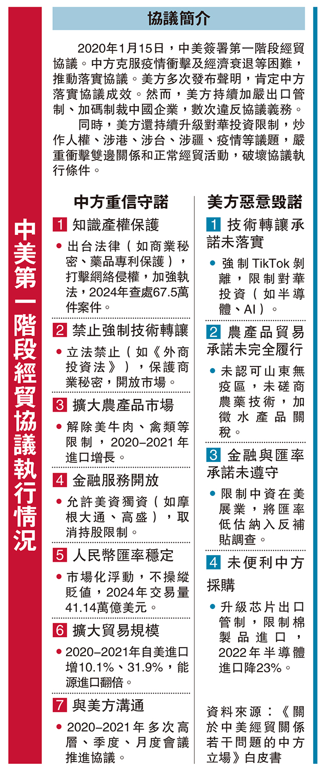 2020年1月15日,中美簽署第一階段經貿協議。中方克服疫情衝擊及經濟衰退等困難,推動落實協議。美方多次發布聲明,肯定中方落實協議成效。然而,美方持續加嚴出口管制、加碼制裁中國企業,數次違反協議義務。