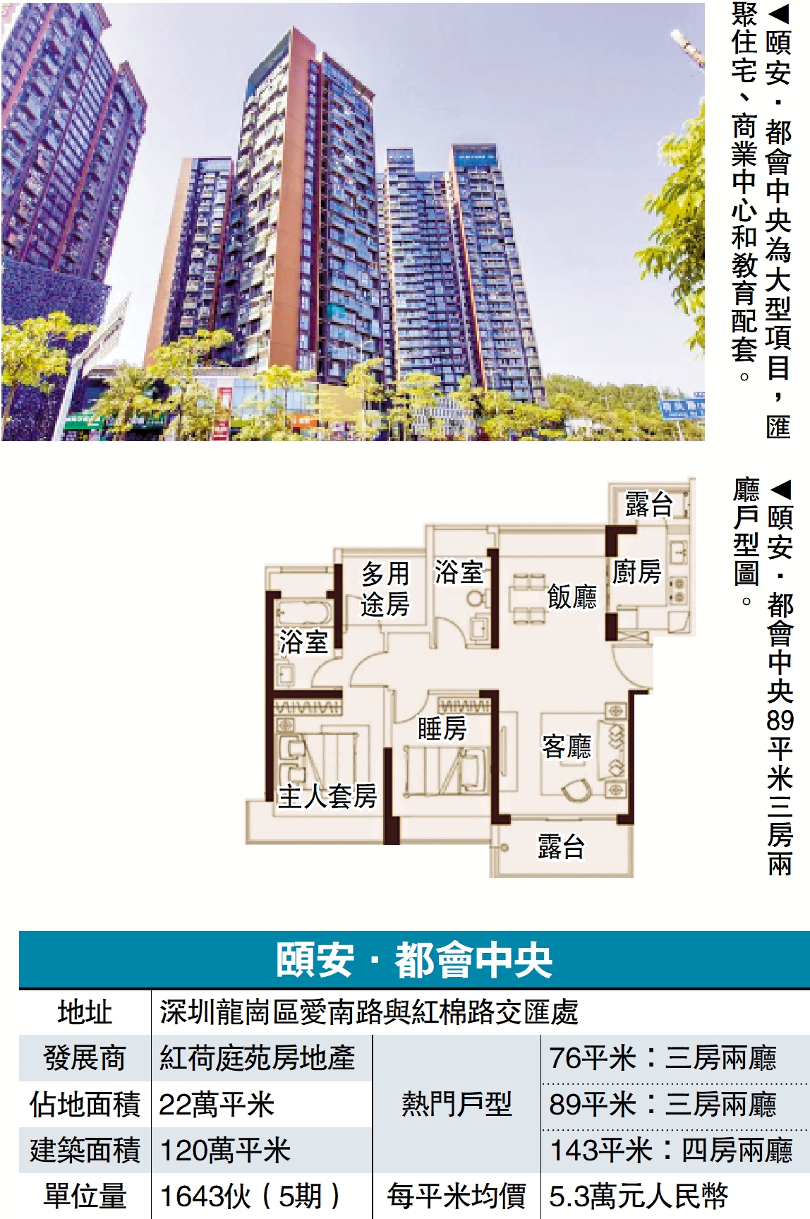 頤安·都會中央佔地22萬平米,建築面積120萬平米,集高端住宅、商業中心、教育配套於一體,打造深圳東部「產城人融合」標桿社區,共分7期開發,1至5期已入伙。第5期主力戶型為74至143平米三房至四房,市場價在每平米5.3萬元人民幣。
