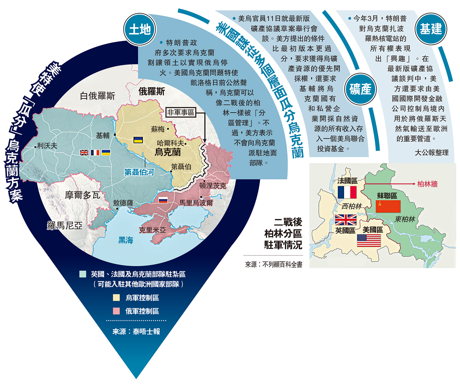 •特朗普政府多次要求烏克蘭割讓領土以實現俄烏停火。美國烏克蘭問題特使凱洛格日前公然聲稱,烏克蘭可以像二戰後的柏林一樣被「分區管理」。不過,美方表示不會向烏克蘭派駐地面部隊。
