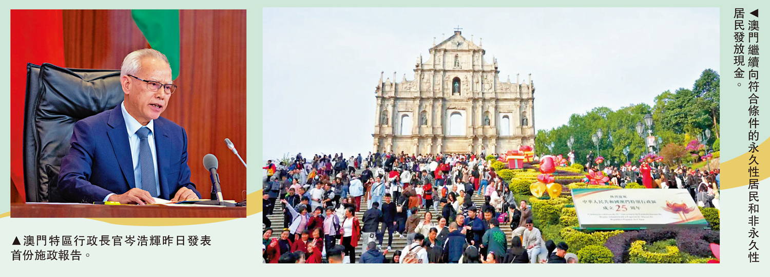 澳門今年將繼續向符合條件的永久性居民和非永久性居民發放現金,分別有10000澳門元和6000澳門元。岑浩輝表示,現金分享制度屬於臨時性輔助措施,會適時完善,屆時將節省的開支用於增進民生福利和促進社區經濟發展之上。\大公報記者 龔學鳴