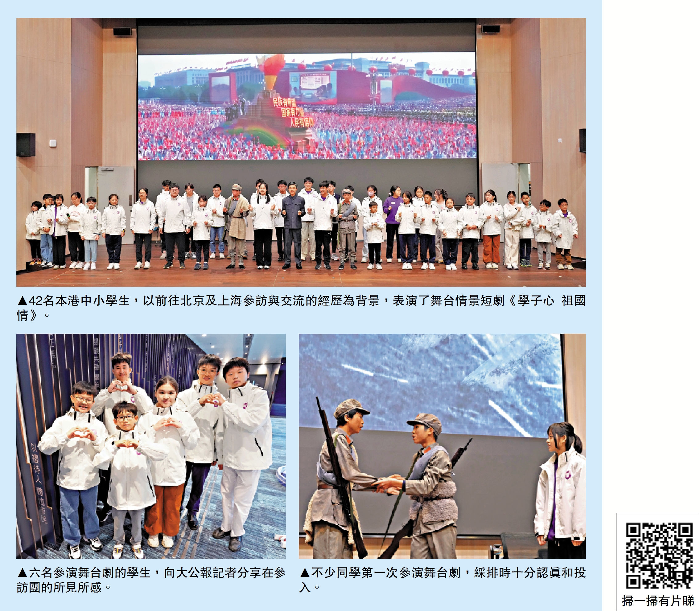 朱晁陞就讀於聖公會李兆強小學,首次到訪北京,首都的繁華留下非常深刻印象。在行程中,他最難忘參觀清華大學,「那裏的大哥哥大姐姐都很厲害,而且很謙虛」,令他萌生日後去該校讀書的想法。他亦對國家航天發展很感興趣,希望日後從事守護國家安全、回饋社會的職業。他說,許多同學首次參加話劇,綵排過程中發生很多趣事,「這是大家值得一起學習的寶貴經驗。」