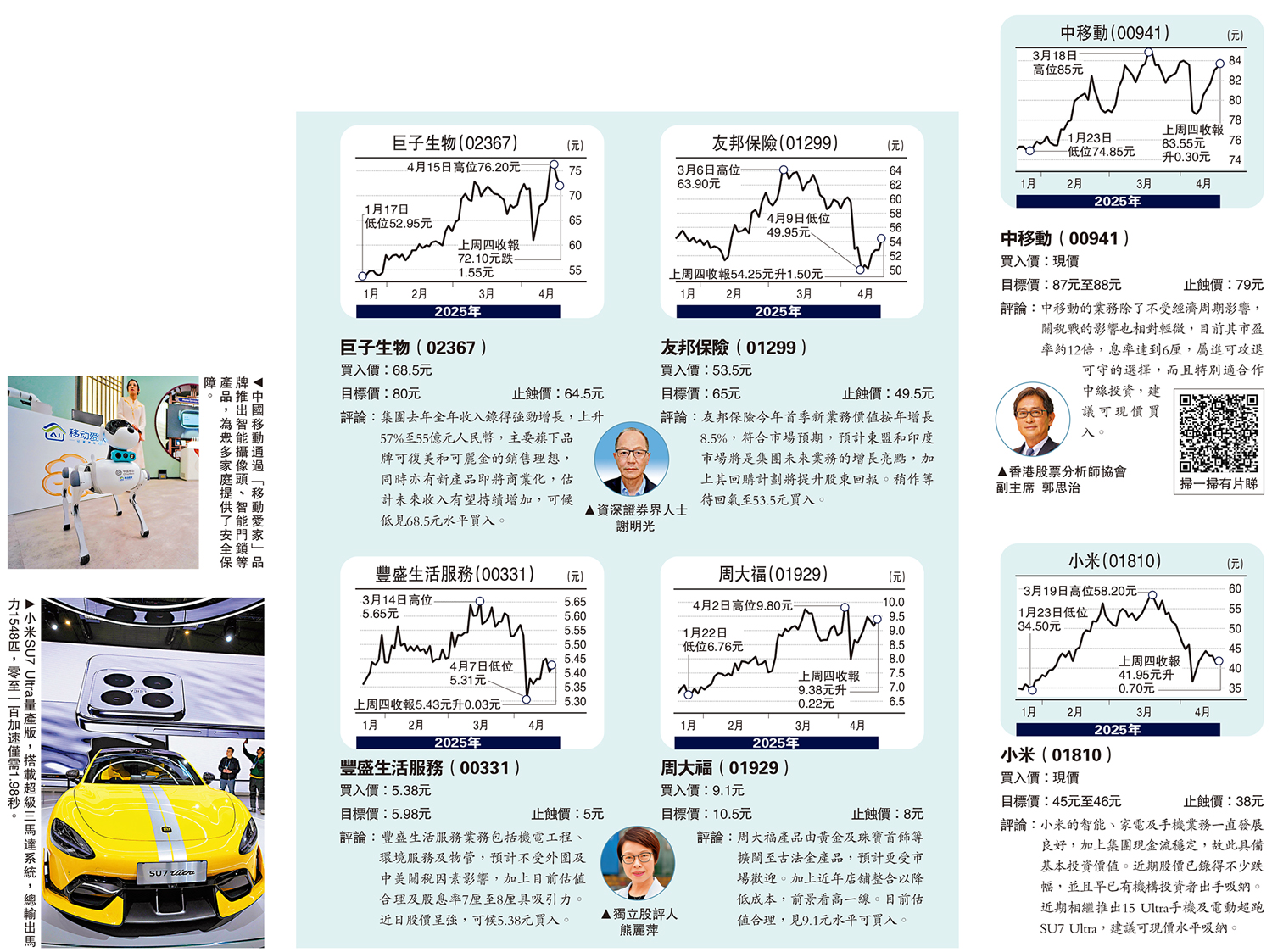 復活節長假前夕港股反覆造好,恒生指數上周累計升480點,結束連續五周下跌。美國4月開始向全球開打關稅貿易戰,市場正在審視對經濟表現的影響,惟投資者估計內地具有極強的韌性和適應能力。專家建議可留意受關稅影響相對輕微的中移動(00941)及股價已呈超賣的小米(01810)。