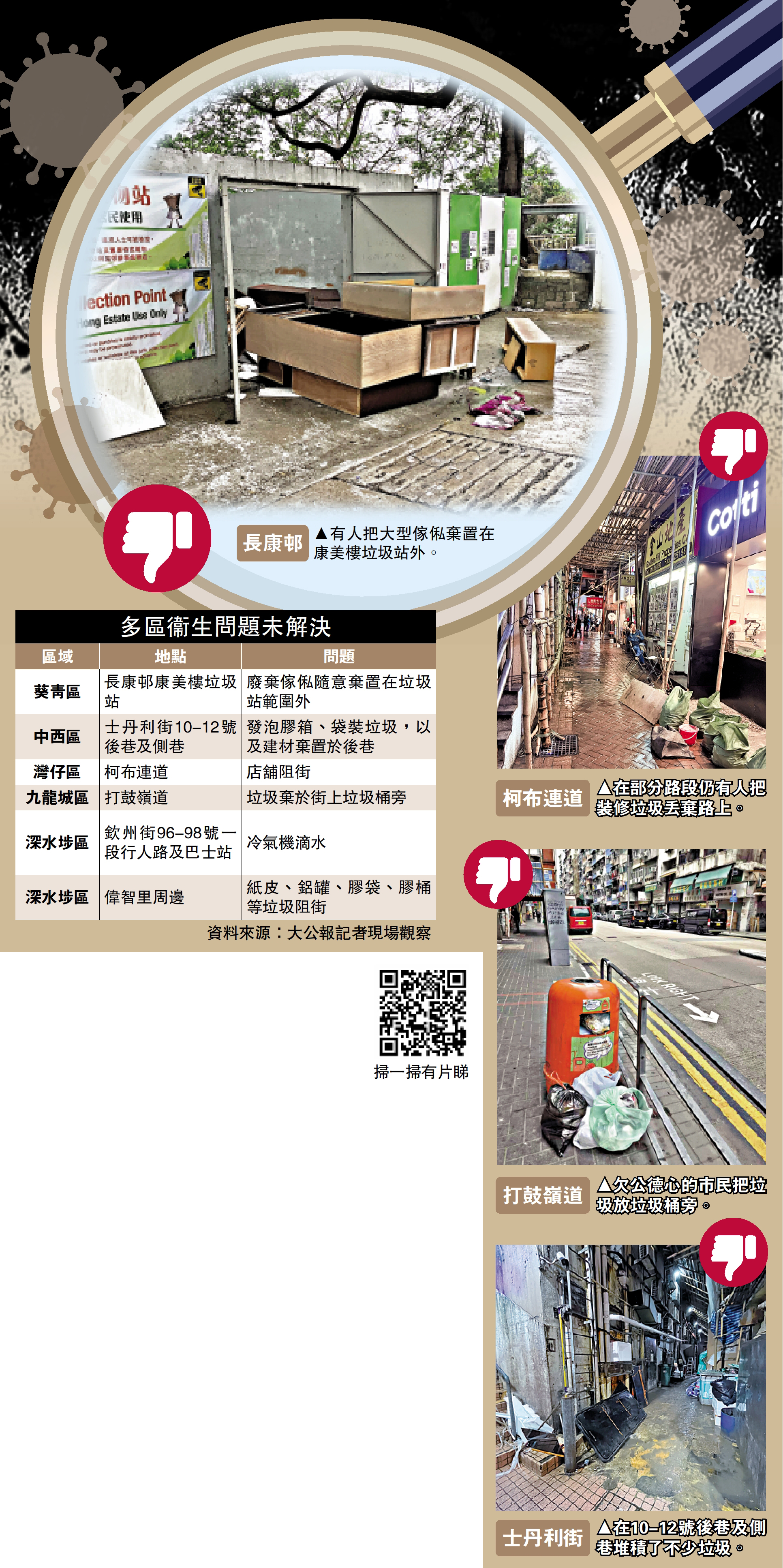 大公報記者多日到訪葵青區、九龍城區、深水埗區、南區、灣仔區及中西區了解衞生情況,見到部分地區衞生情況改善明顯。