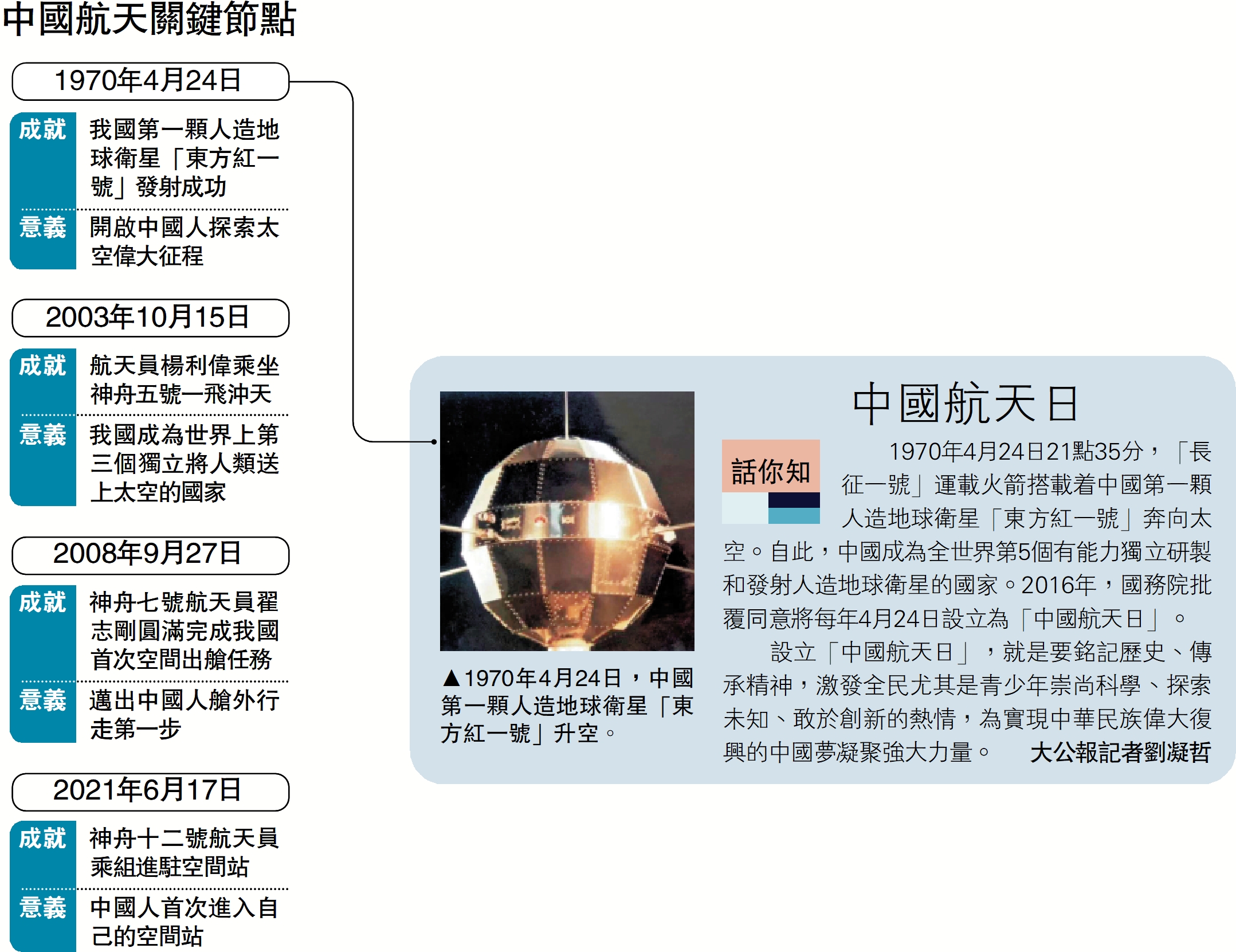 設立「中國航天日」,就是要銘記歷史、傳承精神,激發全民尤其是青少年崇尚科學、探索未知、敢於創新的熱情,為實現中華民族偉大復興的中國夢凝聚強大力量。\大公報記者劉凝哲