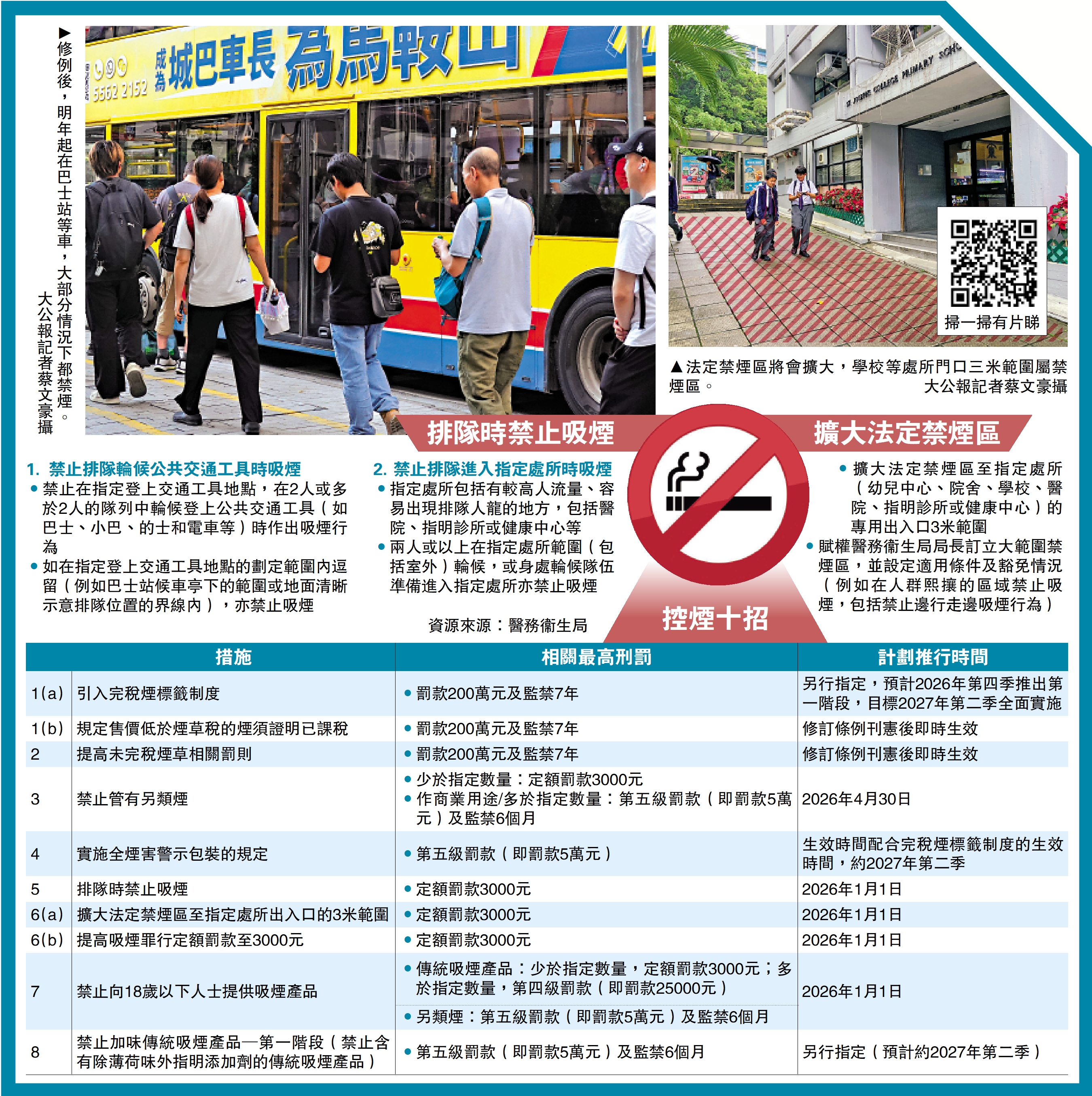 政府修例加強控煙,「控煙十招」修例草案昨日刊憲。攜帶多於19支免稅煙入境的定額罰款增至5000元、販售低於煙稅的香煙須證明已課稅,昨日起生效;明年1月1日起,禁止在輪候公共交通工具的劃定範圍吸煙,幼兒中心、醫院等出入口3米範圍內劃為禁止吸煙區,並將定額罰款範圍提高一倍至3000元。