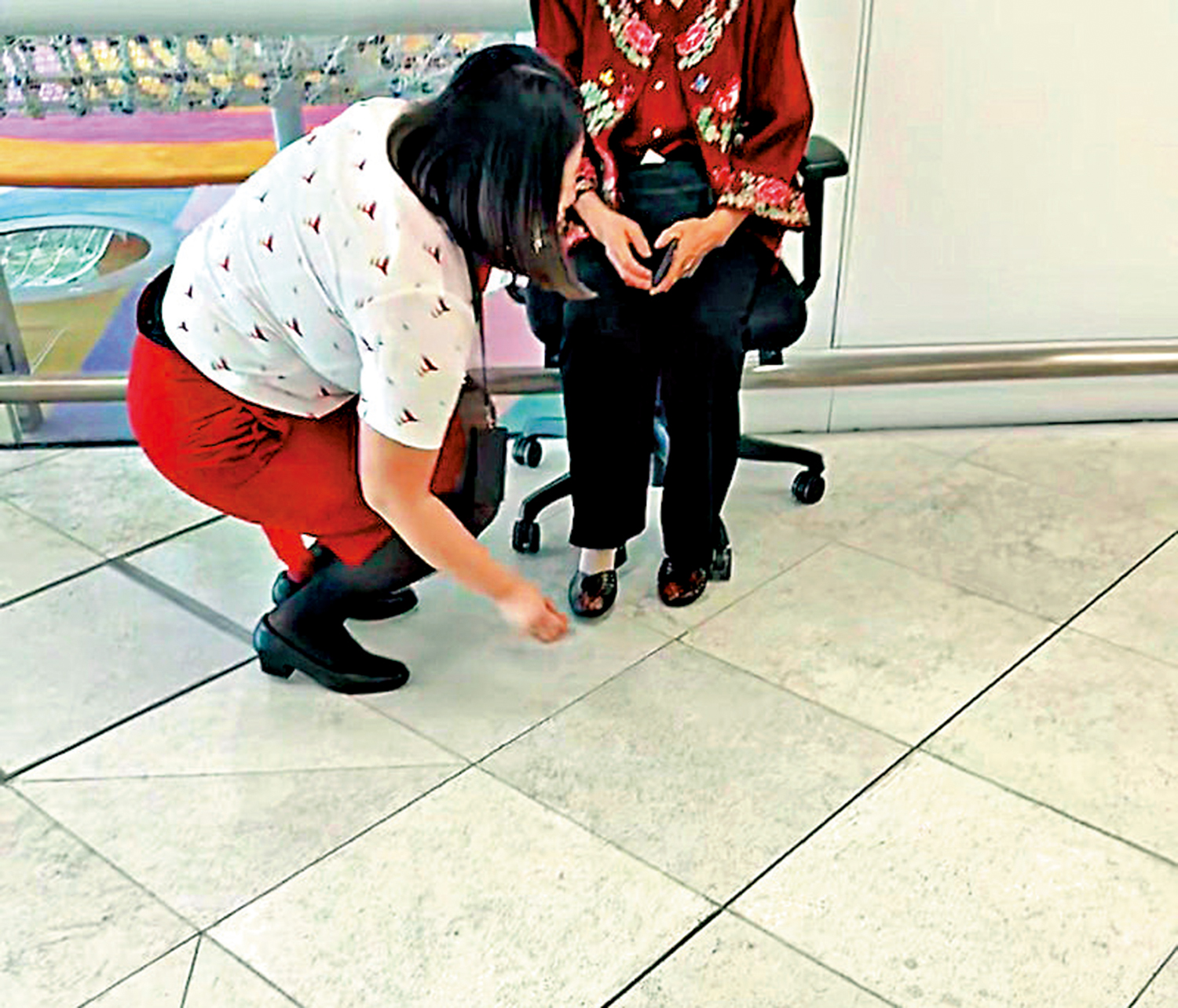 女生協助她找到地勤櫃枱,婦人表現自責自己愚笨並痛哭,女地勤人員隨即安撫其情緒及提供協助。