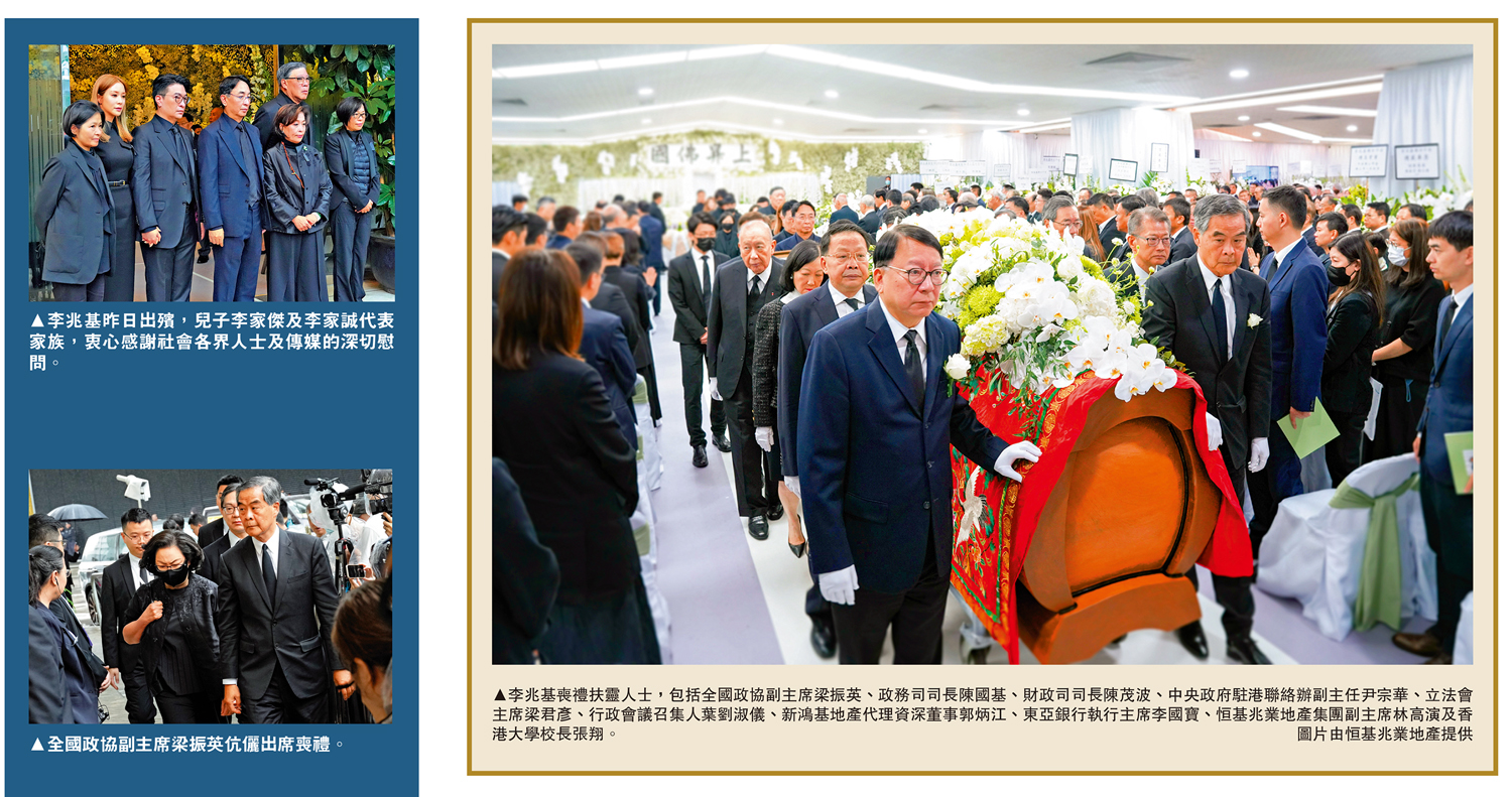 恒基兆業地產集團創辦人李兆基於3月17日安詳離世,積閏享壽一百歲。李家周日在北角香港殯儀館設靈,昨日出殯。喪禮由政商界翹楚擔任扶靈人,包括全國政協副主席梁振英、財政司司長陳茂波及中央政府駐港聯絡辦副主任尹宗華等。李兆基於昨日中午12時30分辭靈出殯,由集團兩位聯席主席李家傑及李家誠代表家族,衷心感謝社會各界人士及傳媒的深切慰問。\大公報記者 邵淑芬(文) 林少權(圖)
