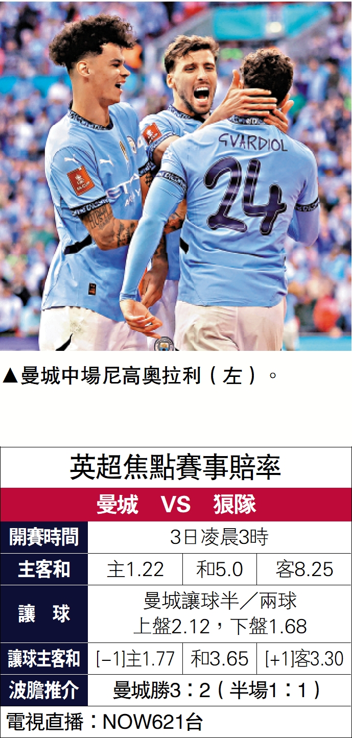 【大公報訊】曼城已越來越接近完成在英超取得前5名及在足總盃奪標的雙目標,明晨力保英超前5,主場欣逢走勢強勁的狼隊,不過曼城自己亦有回勇之勢,有力小勝一場,故「讓球」曼城要讓球半/兩球略多,寧敲下盤。(NOW621台明晨3時直播)