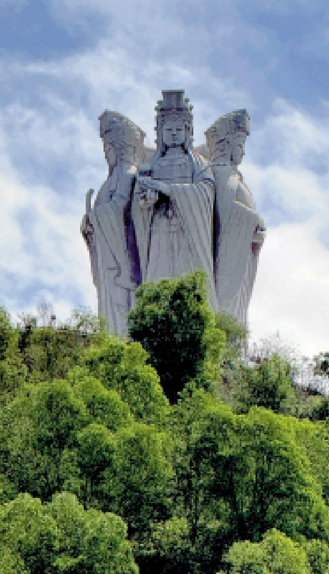 拾階而上,俯瞰是一片淺海魚排密布的美麗海港風景,仰望則是面容端詳、慈眉善目的五媽祖石雕像,視覺效果震撼。