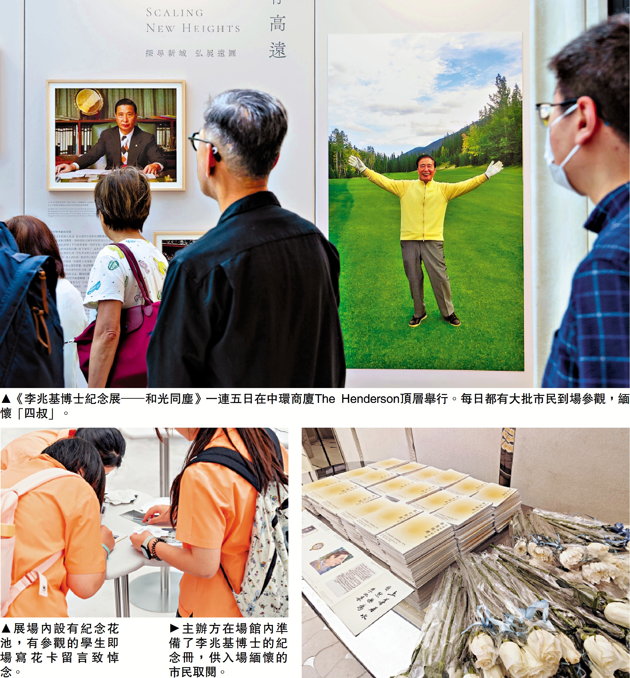 39樓的展覽現場,四個板塊前都有市民駐足觀看,當中既有拄着拐杖的老者,亦有背着書包的學童。人們紛紛寫下悼念文字,表達對「四叔」的深切緬懷,有中大校友留言說:「感謝李兆基博士作育功深,嘉惠後學……常作無私奉獻」。