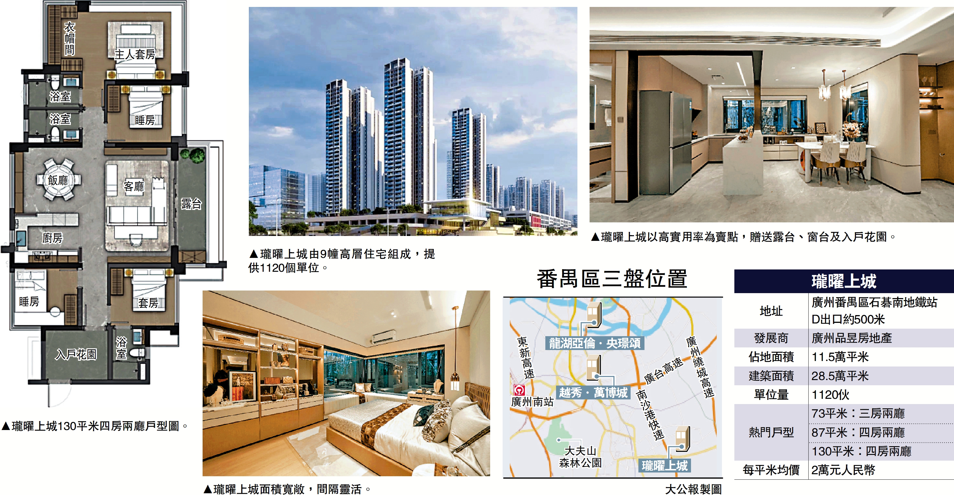 價格方面,瓏曜上城每平米均價2萬元,當中73平米三房戶入場費約145萬元(約155萬港元),最大面積130平米四房雙套戶型,總價約312萬元。對於一個鄰近地鐵、又有九年制學校配套的新盤而言,性價比吸引。\大公報記者 盧靜怡廣州報道
