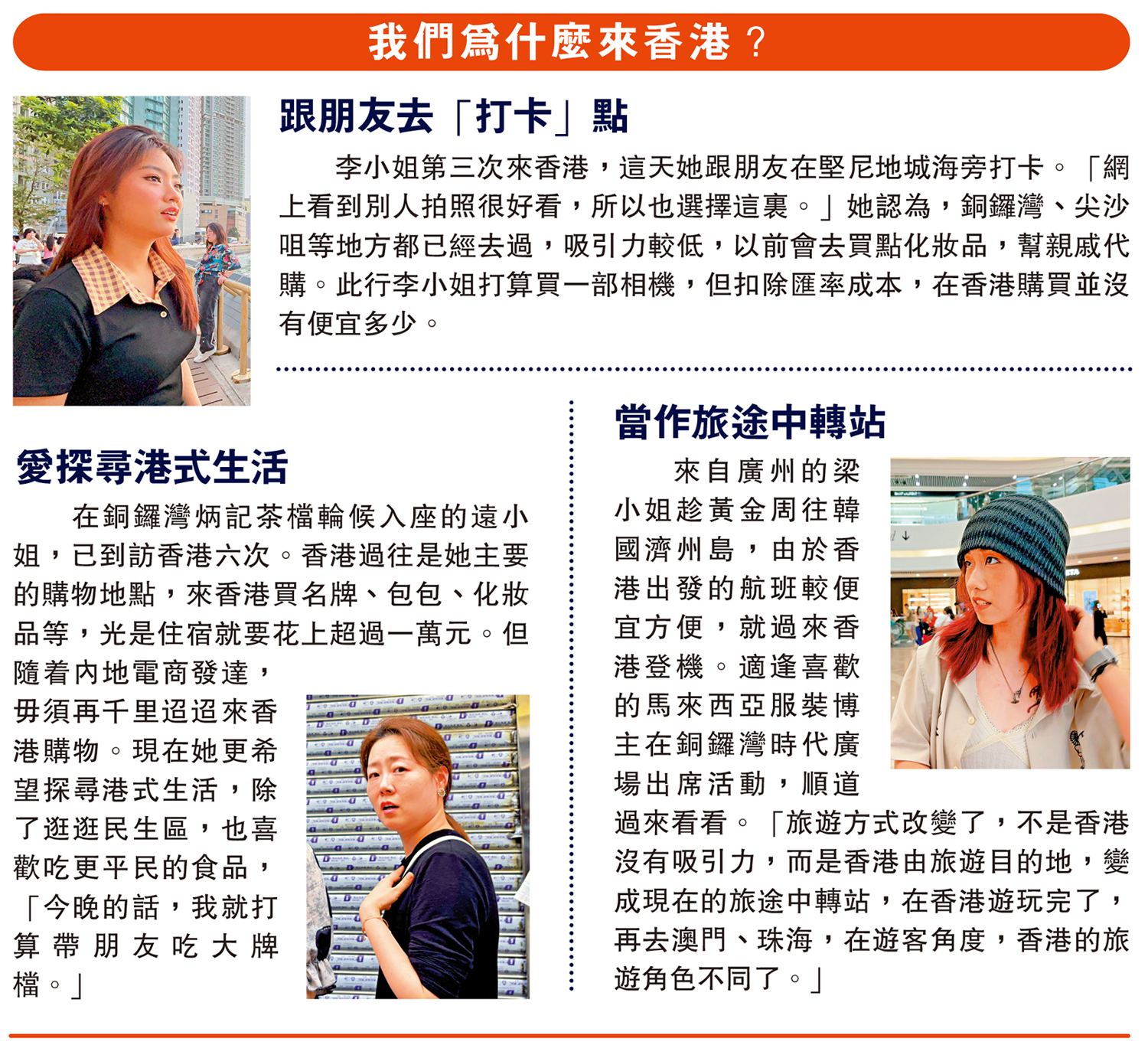 來自廣州的梁小姐趁黃金周往韓國濟州島,由於香港出發的航班較便宜方便,就過來香港登機。適逢喜歡的馬來西亞服裝博主在銅鑼灣時代廣場出席活動,順道過來看看。「旅遊方式改變了,不是香港沒有吸引力,而是香港由旅遊目的地,變成現在的旅途中轉站,在香港遊玩完了,再去澳門、珠海,在遊客角度,香港的旅遊角色不同了。」