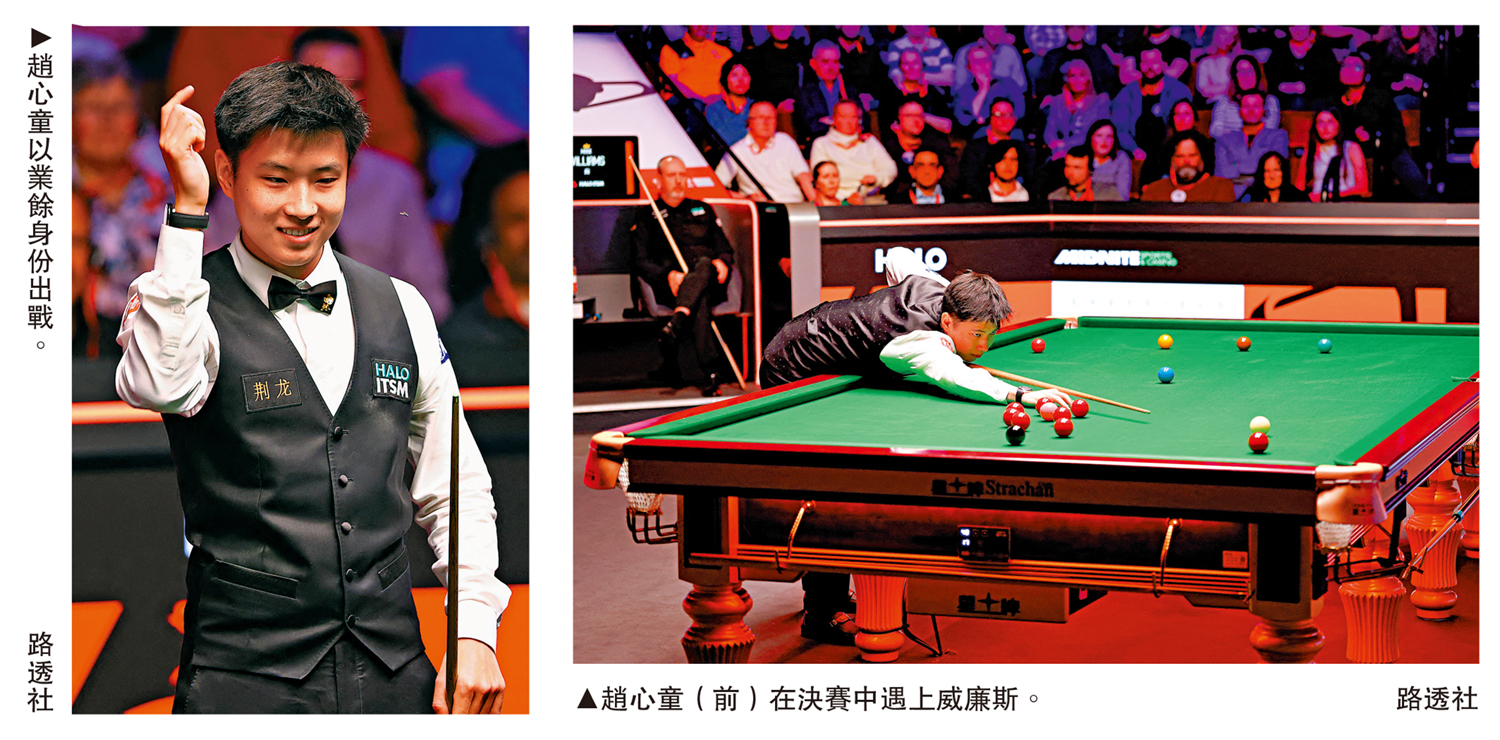 【大公報訊】世界桌球錦標賽昨天在英國謝菲爾德克魯斯堡劇院舉行,並完成3節賽事,由首位以業餘身份出戰決賽的中國球手趙心童,對陣歷來晉級決賽年紀最大(50歲)的威爾士名將威廉斯。趙心童在首節已遙遙領先7:1,次節威廉斯小勝5:4後,兩節結束趙心童仍在35局18勝的決賽遙遙領先11:6,至第3節趙心童維持表現並拉開至17:8,只欠一局,趙心童便成為歷來首位奪冠的中國球手。