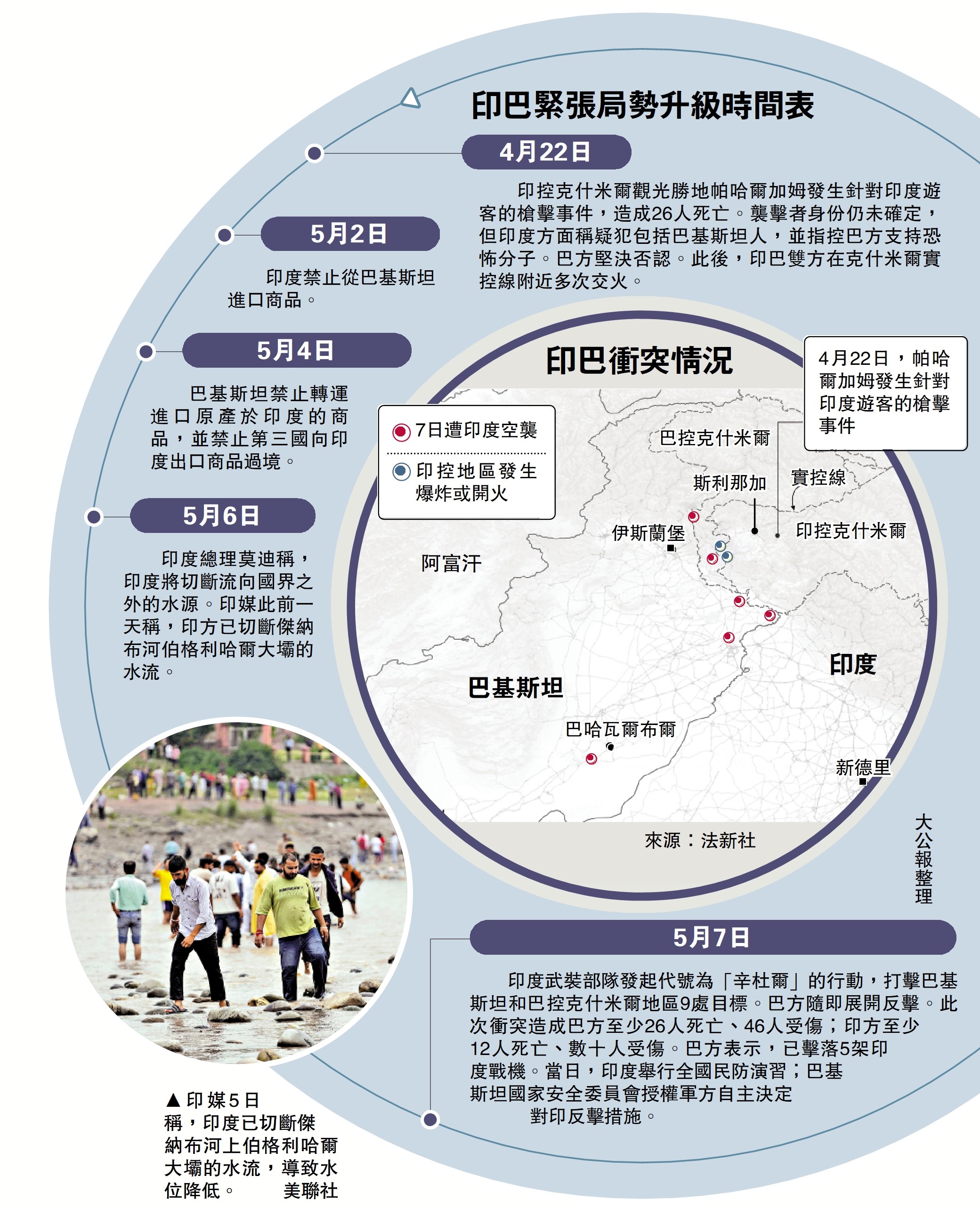 印度武裝部隊發起代號為「辛杜爾」的行動,打擊巴基斯坦和巴控克什米爾地區9處目標。巴方隨即展開反擊。此次衝突造成巴方至少26人死亡、46人受傷;印方至少12人死亡、數十人受傷。巴方表示,已擊落5架印度戰機。當日,印度舉行全國民防演習;巴基斯坦國家安全委員會授權軍方自主決定對印反擊措施。