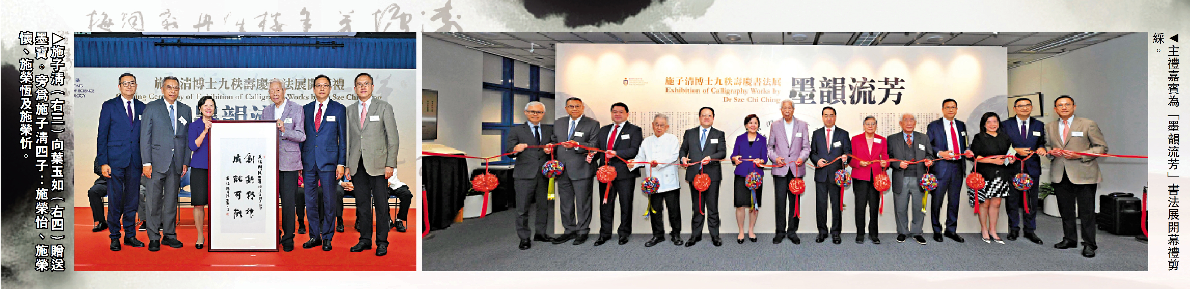 「墨韻流芳」施子清九秩壽慶書法展昨日舉行開幕禮,是次展覽在香港科技大學李兆基圖書館舉辦,展品涵蓋多幅香港大紫荊勳賢、中國書協香港分會主席施子清的書法作品,包括古詩詞名句及施子清個人書法創作,展現其豐富的文化內涵。\大公報記者 李兆桐