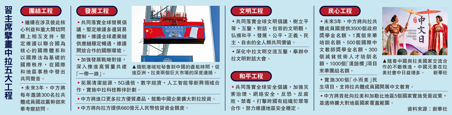 •實施300個「小而美」民生項目,支持拉共體成員國開展中文教育。