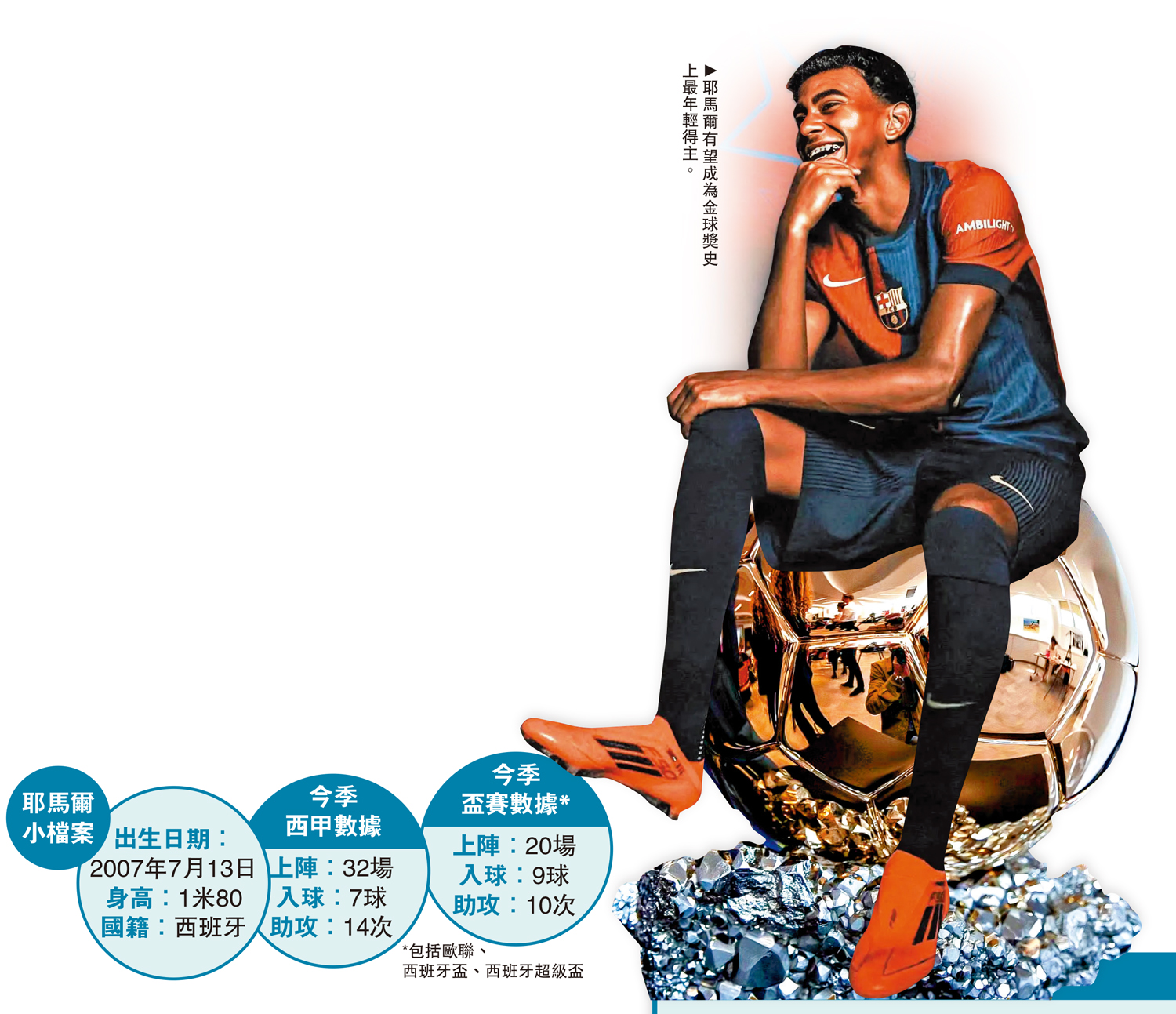 巴塞隆拿17歲超新星耶馬爾在上季嶄露頭角,隨後的歐洲國家盃更鋒芒畢露,今季順理成章擔正球隊主力亦有獨當一面演出,不斷為球迷獻上精彩的盤扭與漂亮的射門,在今季的4項賽事都有「士哥」,領銜巴塞衝擊國內「三冠王」。儘管耶馬爾年紀尚輕,但環顧今季各大聯賽鮮有獨當一面的球員,而且不少球壇名人開始看好之下,耶馬爾有力挑戰金球獎史上首位20歲以下得主的榮譽。\大公報記者 譚德龍