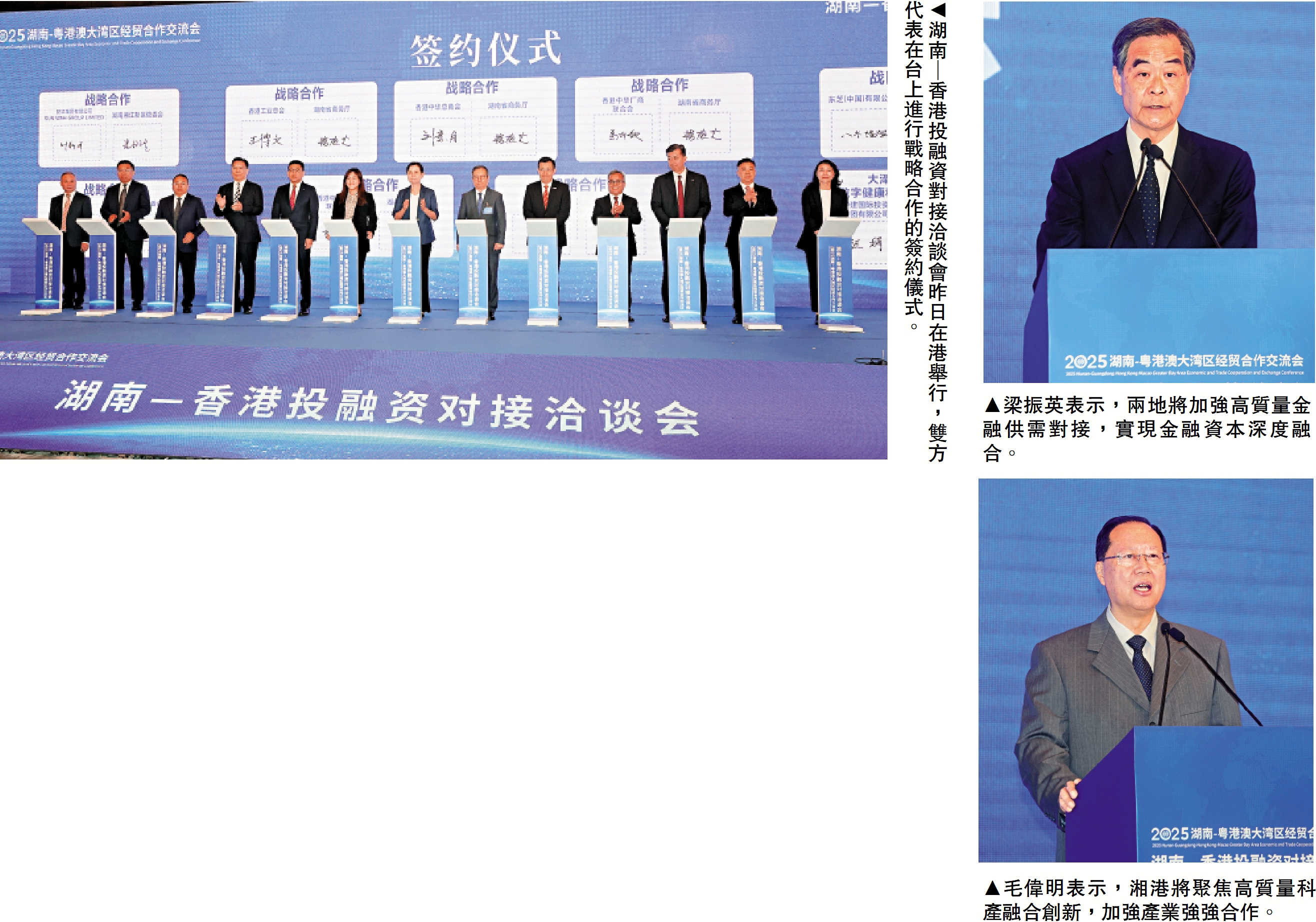 湖南省省長毛偉明發表講話時,回顧了湘港合作歷程,指出香港是湖南境外第一大貿易夥伴、融資的第一選擇地和湖南入境遊第一大客源地。\大公文匯全媒體記者 蔡競文(文)、郭木又(圖)