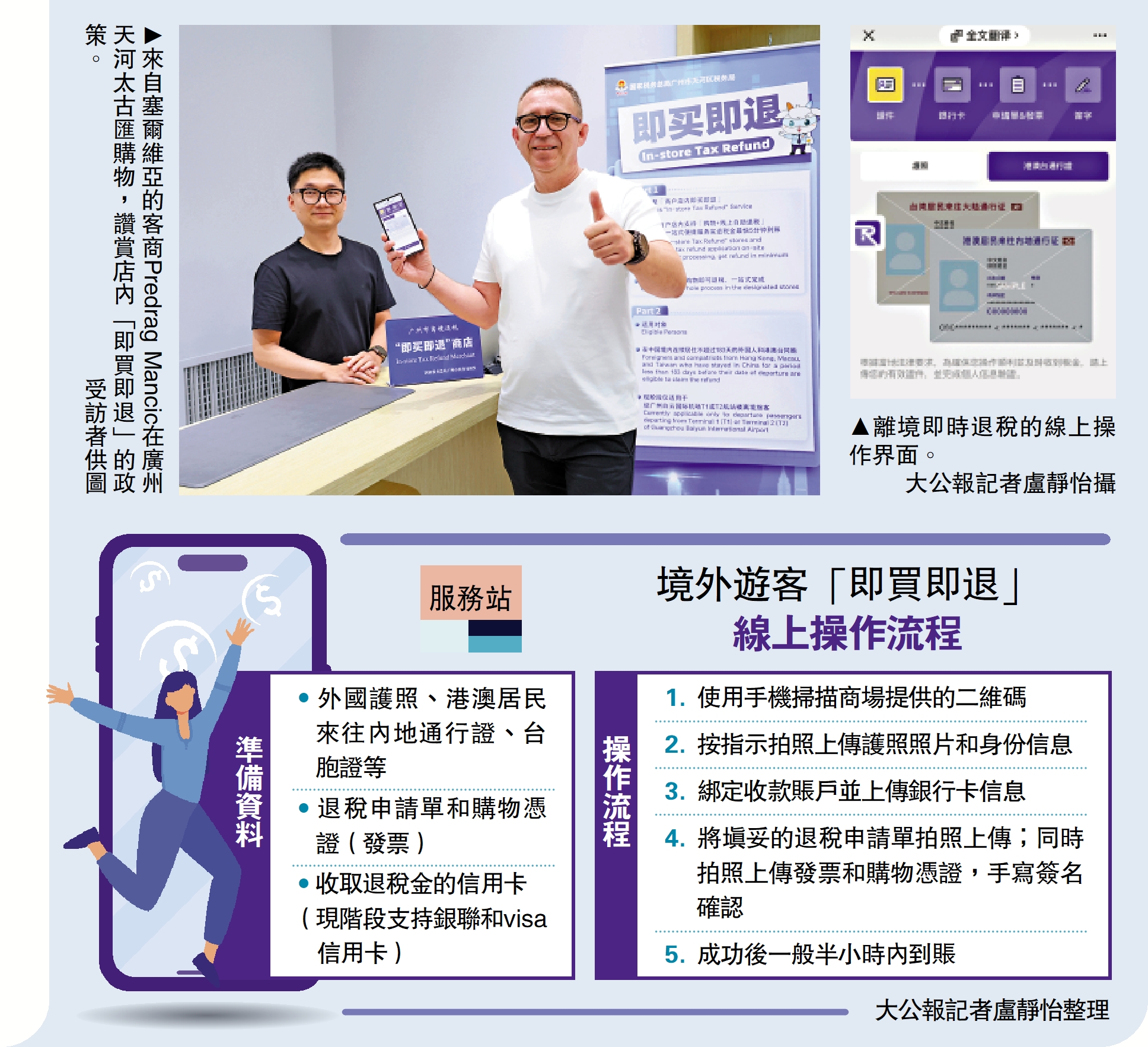 國家稅務總局已將「即買即退」服務措施推廣至全國。以一線城市廣州為例,廣州目前共有離境退稅商店365家,其中,「即買即退」商店已擴圍至67家。境外旅客及港澳台同胞,只要在內地連續居住不超過183天,即可參與「即買即退稅」活動。在允許「即買即退」稅的商場內,入境旅客在參與商戶購買了心儀商品後,可直接在門店內使用個人手機掃描商場提供的二維碼,上傳相關信息與憑證,即可一站式完成線上退稅流程,退稅金最快5分鐘直達賬戶。「當場就拿到了退稅,感覺太方便了!」來自塞爾維亞的遊客Predrag Mancic表示。