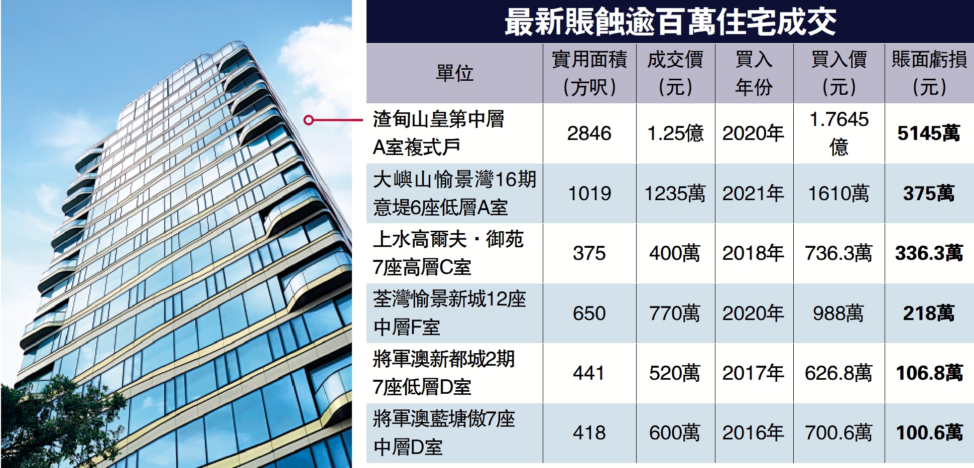 其次,一代「亞洲樓王」、東半山傲璇頂層特色戶,實用面積5444方呎,今年3月以5.12億元連2個車位易手,原業主於2015年以5.096億元一手購入,一度刷新亞洲分層單位造價新高,持有10年只升240萬或0.46%,計及釐印費及佣金等支出,料實蝕約2440萬元。