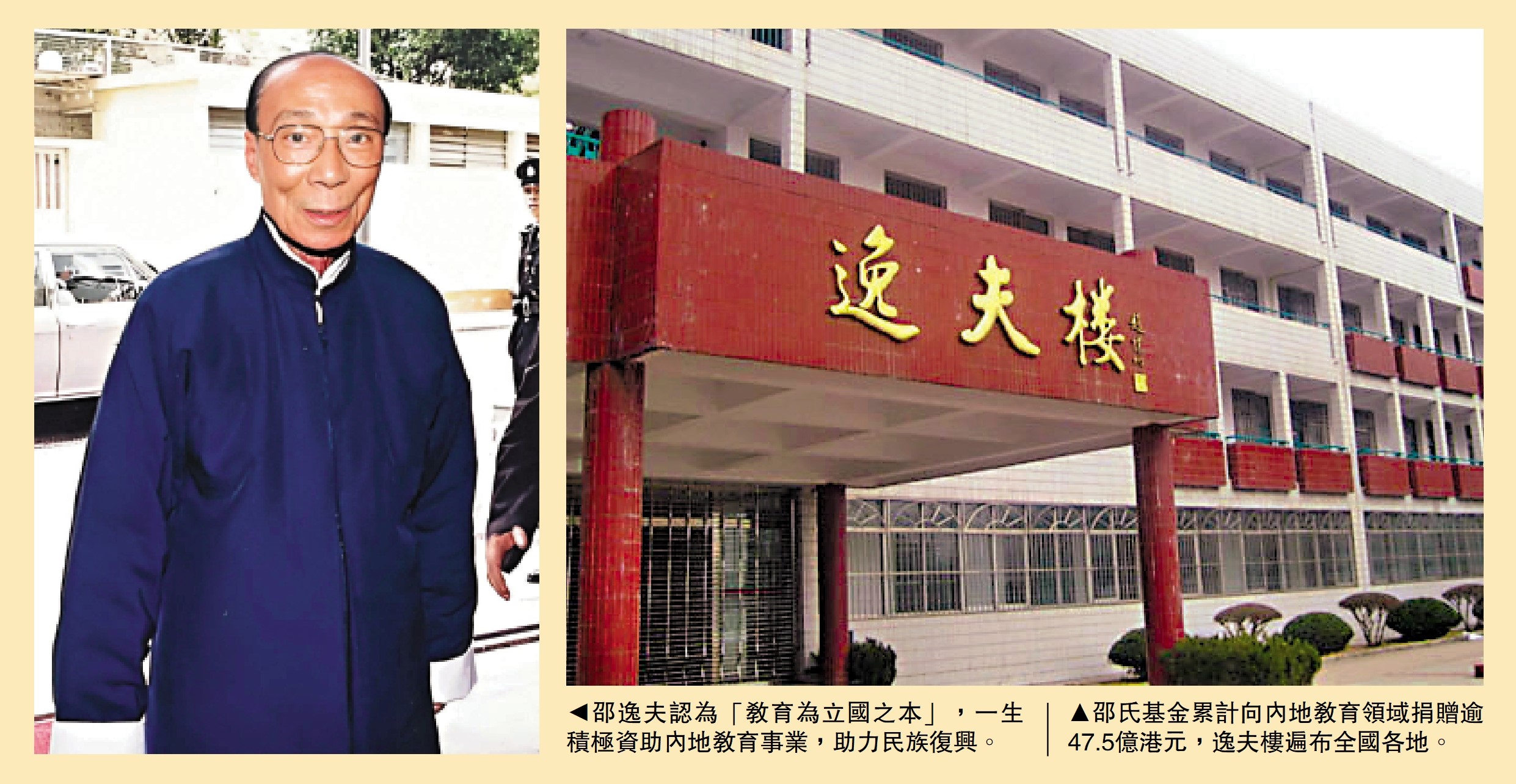 在國家發展的每個關鍵節點,邵逸夫從未缺席。改革開放後,邵逸夫致力支持內地教育與醫療事業等發展。邵逸夫曾說,他生於清朝末年,彼時中國積弱積貧,政府腐敗無能,百姓多為文盲,故總被世界列強欺負。他認為,「教育為立國之本」,只有提高國民的教育水平,才是從根本上解決中國的問題。內地很多重點高校和中學都有以邵逸夫命名的建築物。
