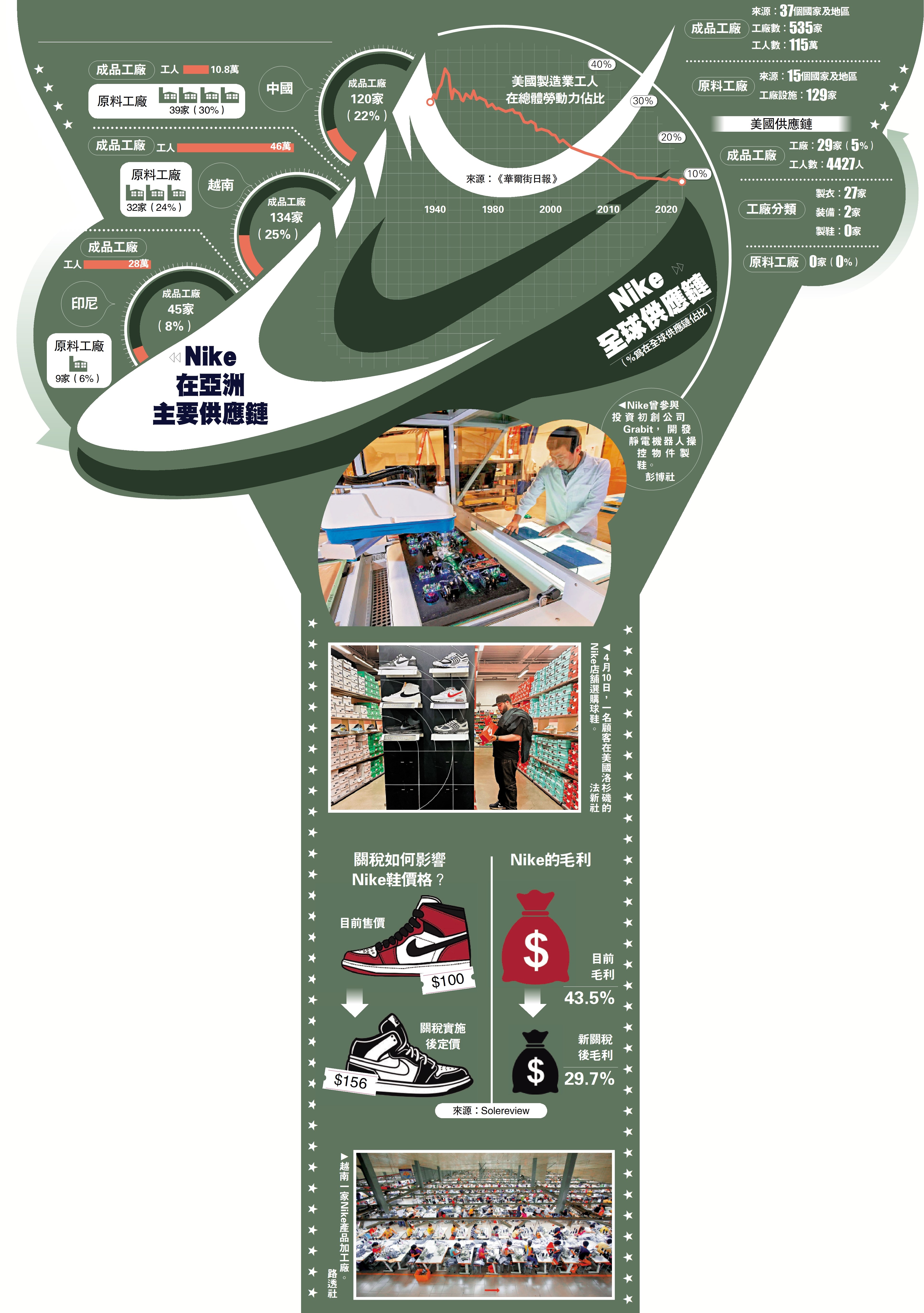 【大公報訊】特朗普在4月初宣布「對等關稅」新政策,供應鏈主要在亞洲的鞋王Nike首當其衝,股價在4月2日當天暴跌14%。5月12日,中美達成互降關稅協議當天,Nike股價上漲了8%,截至5月16日,也一直保存上漲勢頭。從Nike近期的股價波動也可看出,無論是公司本身,到其代工廠商、商品批發商,再到最終的消費者,恐怕都難逃這場成本轉嫁的連鎖反應。