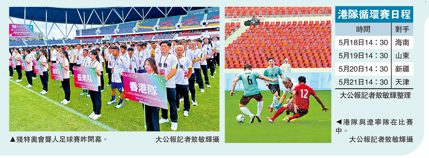 【大公報訊】記者敖敏輝佛山報道:17日上午,全國第12屆殘疾人運動會暨第9屆特殊奧林匹克運動會聾人足球項目(11人制男子組)在佛山南海體育中心開幕,來自內地、香港的12支聾人足球隊共216名運動員齊聚佛山,這是香港聾人足球隊首次登上全國性大賽的舞台。港隊首秀即迎來硬仗,最終以1:4不敵兩屆殘特奧會冠軍遼寧隊,港隊在比賽中攻入遼寧的一球,成為港隊殘特奧會歷史上的首粒進球。賽後,無論是遼寧還是港隊主教練,都對香港首次參賽的表現大加讚賞。