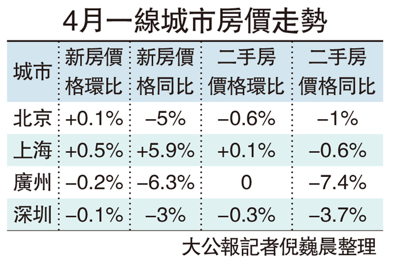 【大公報訊】記者倪巍晨上海報道:國家統計局數據顯示,4月70個大中城市中,上海新房價格以0.5%的環比漲幅領跑70城。國家統計局城市司首席統計師王中華介紹,上月各線城市商品住宅銷售價格環比持平或略降,同比降幅均持續收窄。分析稱,4月是樓市成交淡季,但一線城市需求依然暢旺,成交表現優於預期,熱點二線城市得益於「區域地王」的出現,買家信心持續提振。降準、公積金貸款利率調降等利好政策下,近期LPR(貸款市場報價利率)有望下行,樓市「紅五月」行情值得期待。
